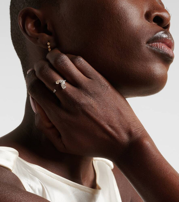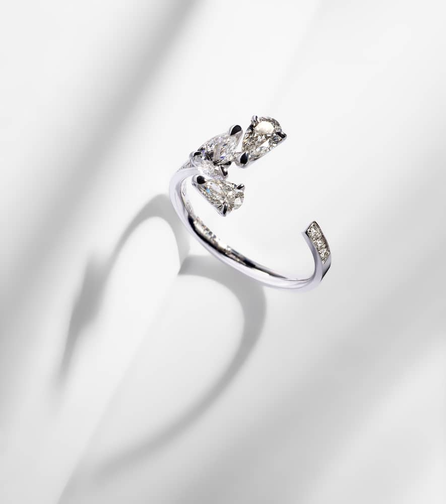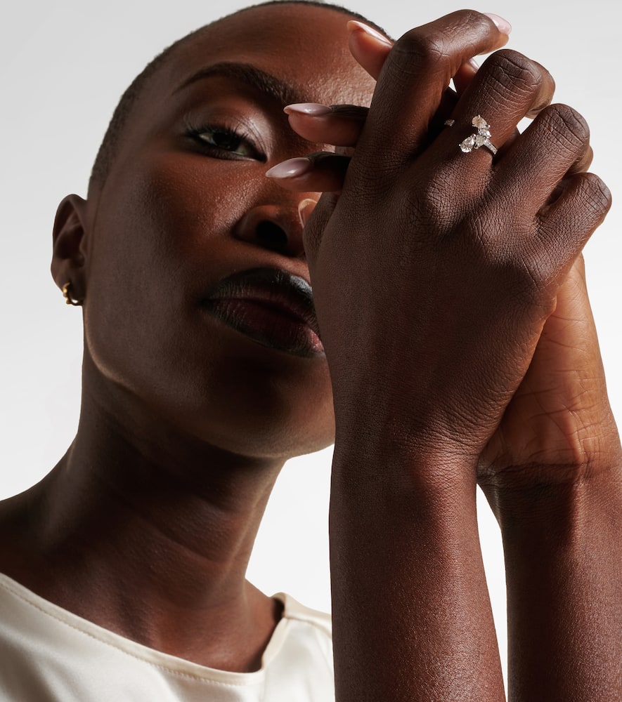 This Repossi Serti Sur Vide 18kt White Gold Ring with Diamonds by Repossi is a modern masterpiece, featuring pear-shaped diamonds set in a distinctive sculptural band, evoking architectural elegance and luxury.