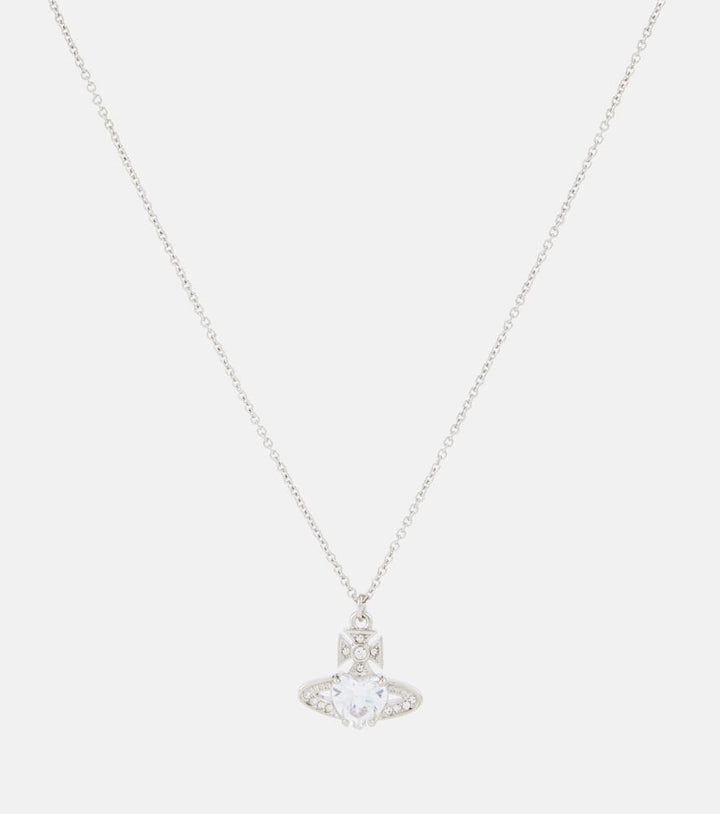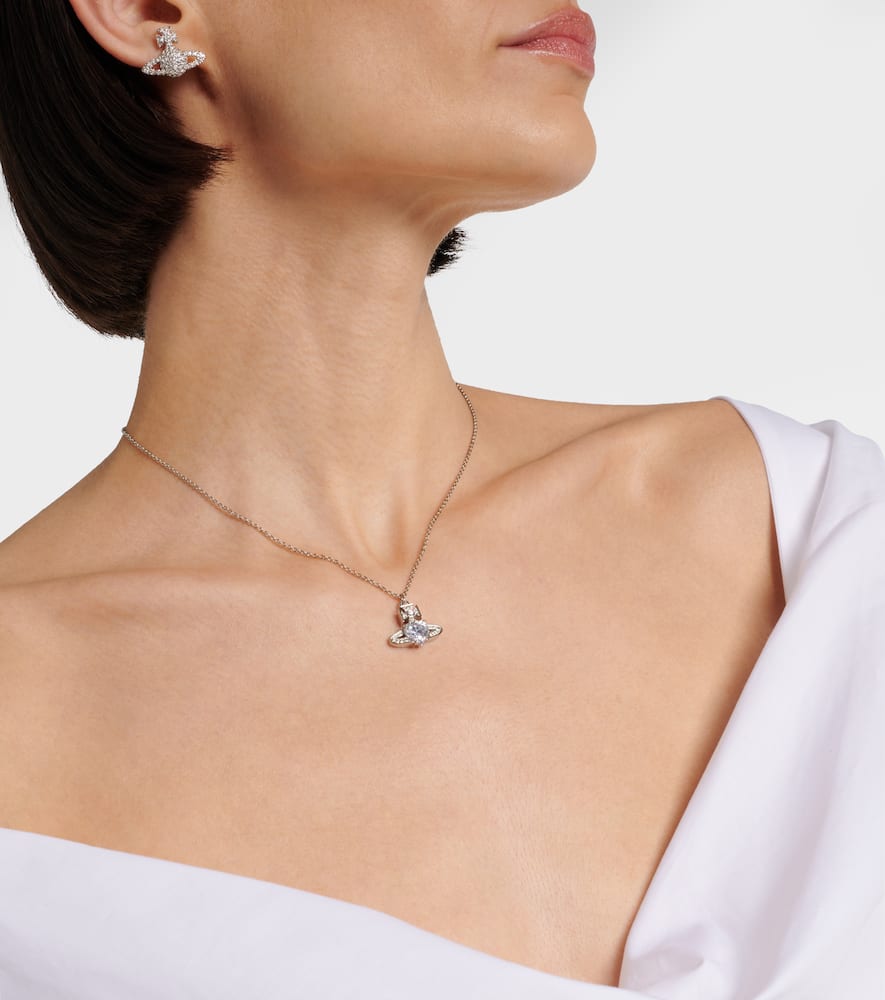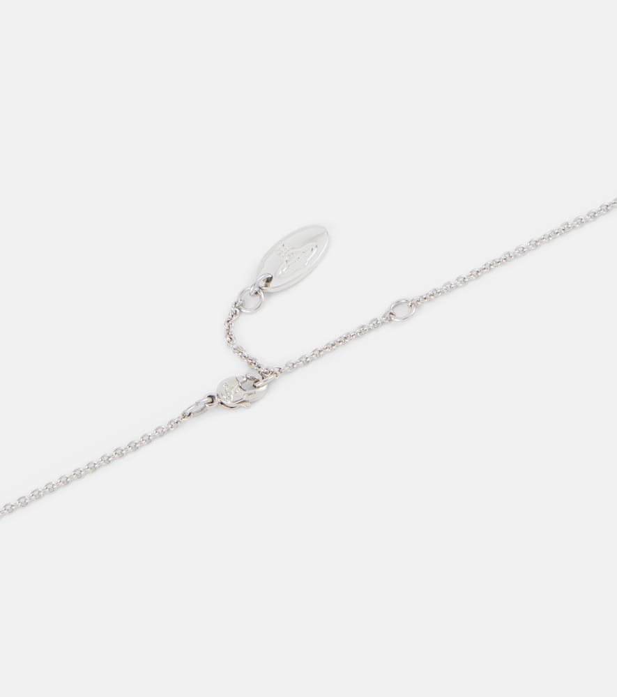 This Vivienne Westwood Ariella Necklace by Vivienne Westwood is a delicate display of modern elegance, featuring sculpted brass and glass stone accents along a refined chain. Its minimalistic design conveys sophistication and versatility, perfect for day-to-night styling.