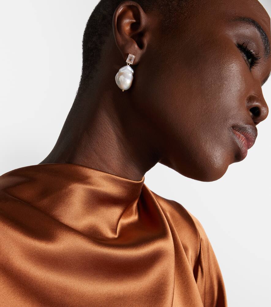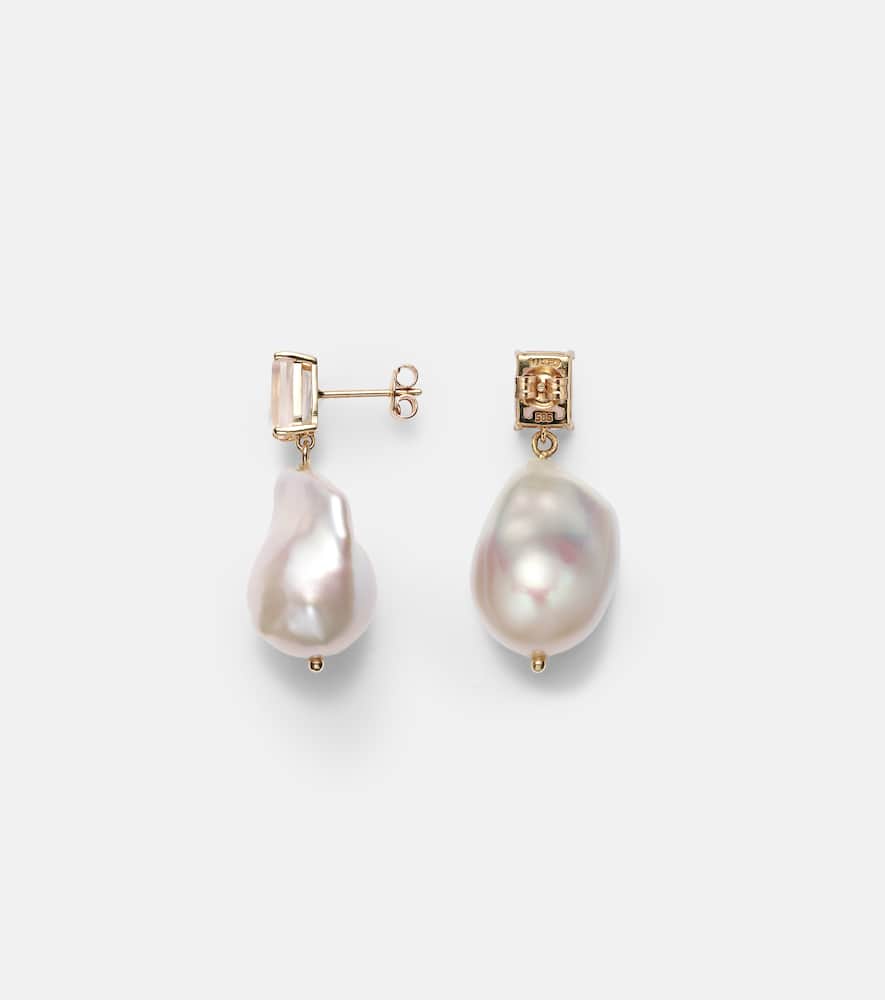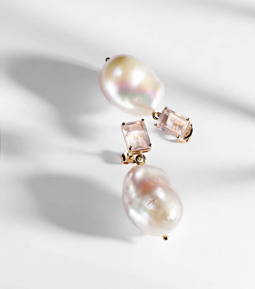 Handcrafted in 14kt yellow gold with emerald-cut rose quartz in prong settings and Chinese freshwater Baroque pearls (Hyriopsis Cumingii, farmed, not CITES-listed). Maximum width 19mm. Post-back fastening. Made in the USA.