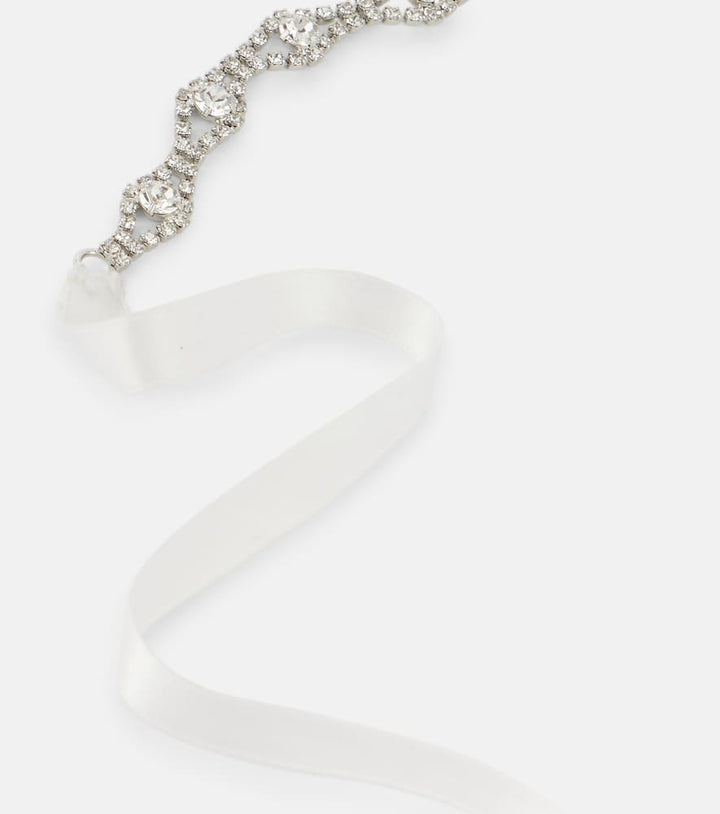 This Rosita Crystal-Embellished Choker by Jennifer Behr is a show-stopping piece that fuses delicate craftsmanship with high-fashion glamour. The slender silhouette, adorned with glittering crystals and silk accents, offers an elegant shimmer, perfect for layering or as a statement neckpiece. It radiates sophistication while maintaining versatility in styling.