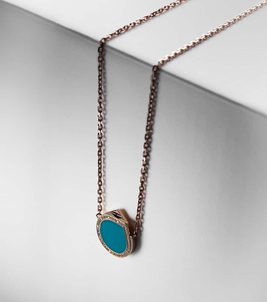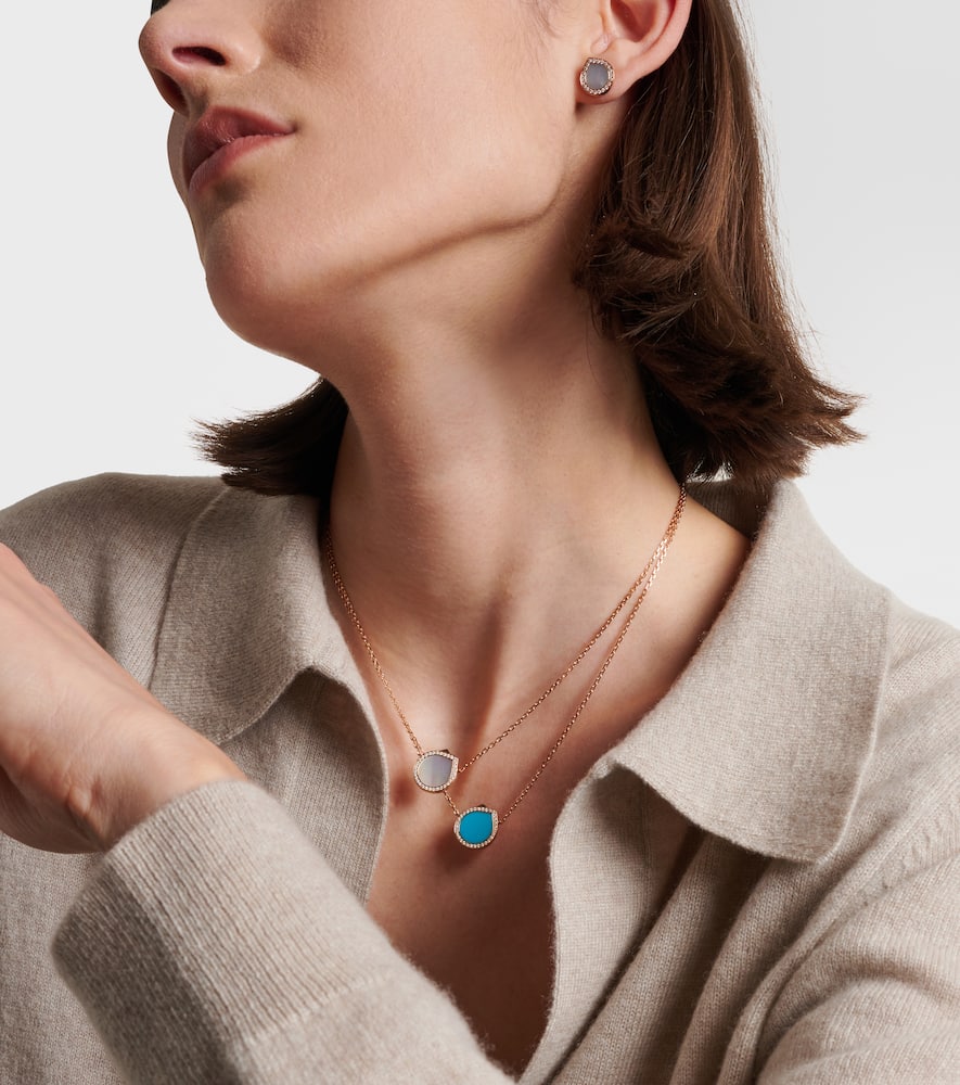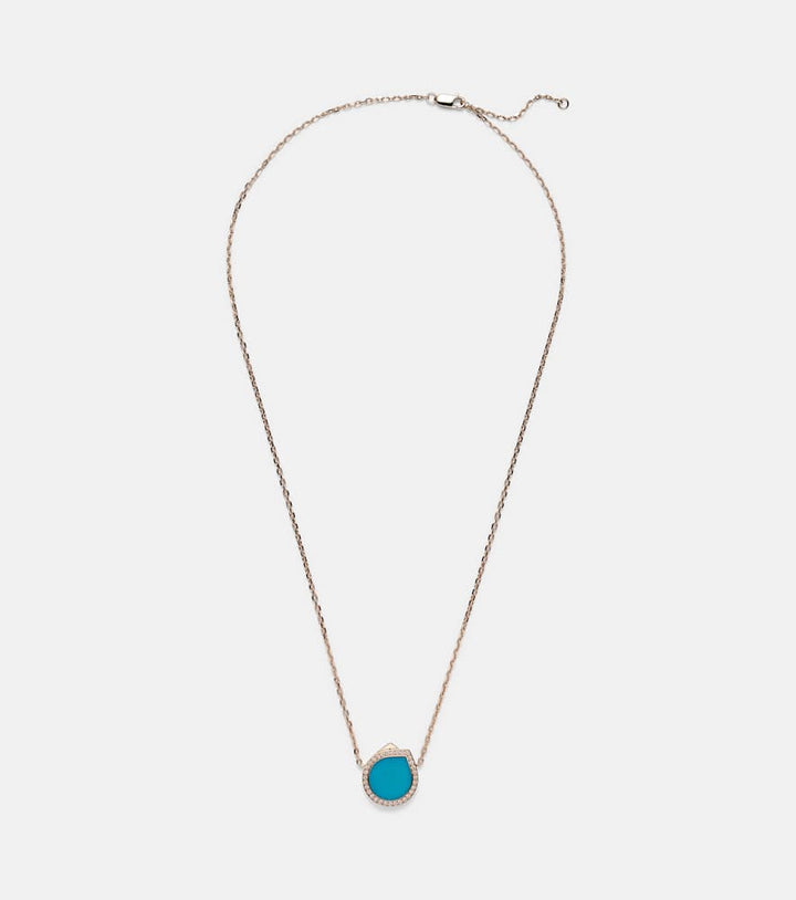 Handcrafted in 18kt rose gold with turquoise and 32 pavé-set round-cut diamonds, total 0.18ct. Pendant length: 16mm; Pendant width: 15mm; Chain width: 1mm; Adjustable length: 42–45cm. Lobster-clasp fastening. Made in Italy.