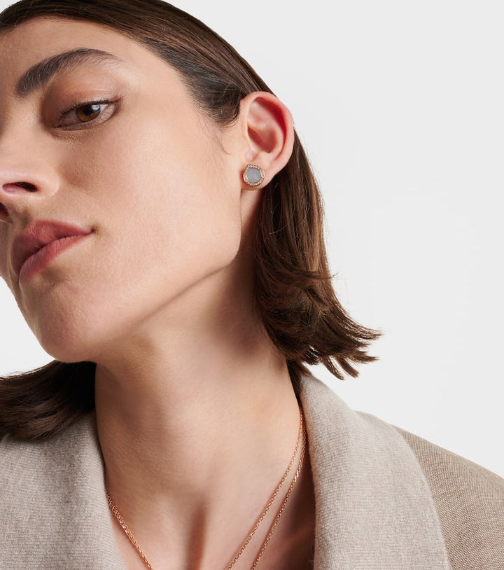 Handcrafted in 18kt rose gold with mother-of-pearl (PINCTADA MAXIMA, Australia) and 22 pavé-set white diamonds, total 0.09ct. Maximum width: 12mm. Post-back fastening. Made in Italy. For pierced ears.