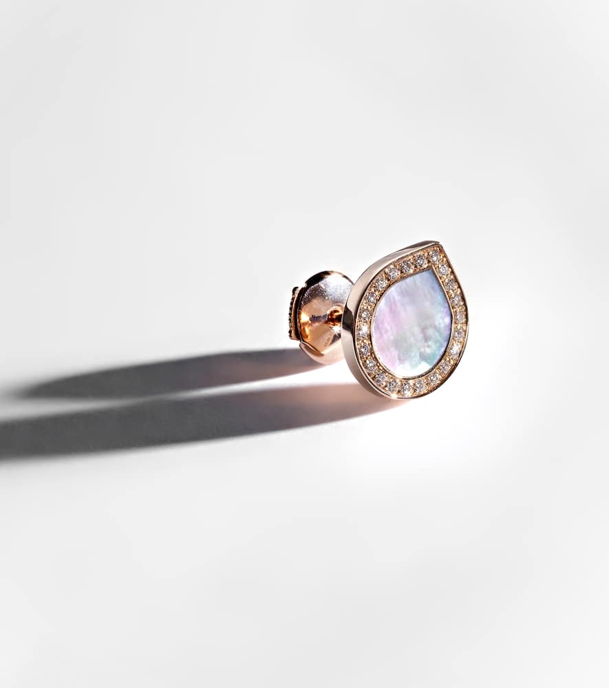 This Antifer 18kt Rose Gold Single Earring with Mother of Pearl and Diamonds by Repossi fuses natural elegance with luminous sparkle. The mother-of-pearl symbolizes purity, complemented by pavé-set diamonds for refined sophistication. Ideal for modern styling, worn solo or paired.
