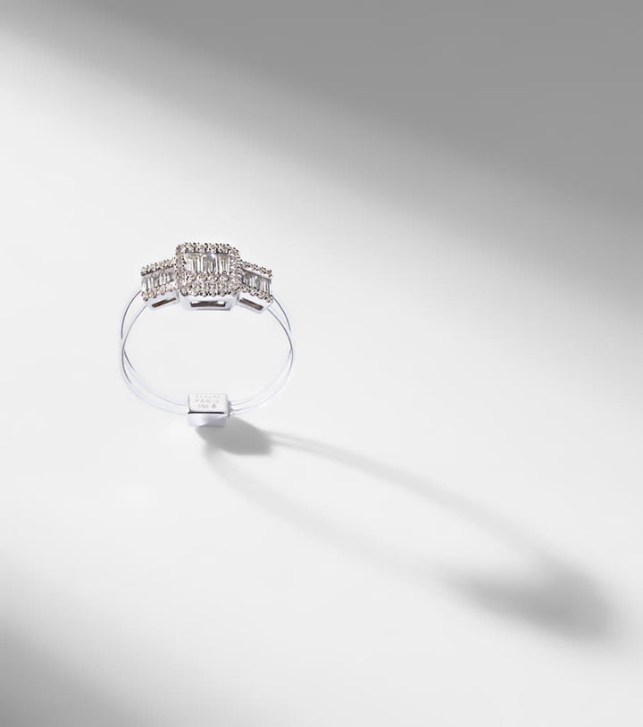 This Floating 18kt White Gold Ring with Diamonds by Persée is a striking blend of modern minimalism and refined sparkle. Featuring a mix of baguette and round-cut diamonds, it conveys elegance, sophistication, and timeless style. Perfect as a statement piece or for stacking with other rings to create a layered, contemporary look.