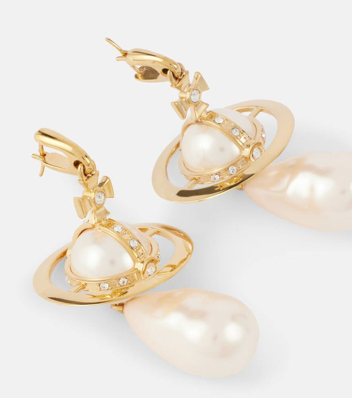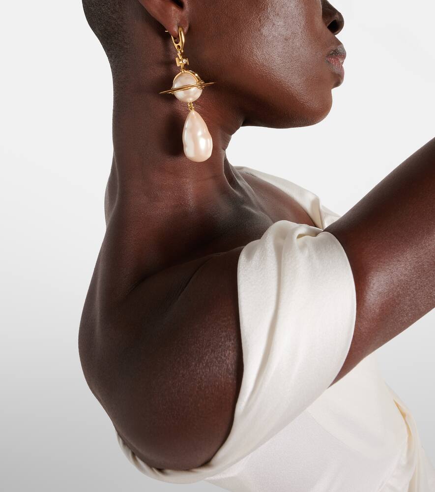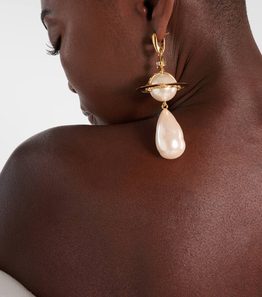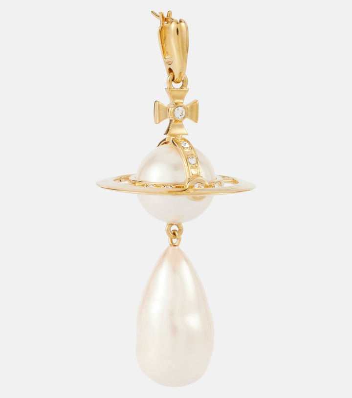 These Giant Pearl Orb Drop Earrings by Vivienne Westwood are a statement of bold elegance and modern femininity. Featuring oversized faux pearls that sway gracefully, they embody sophistication and playful drama, perfect for elevating evening or formal attire.