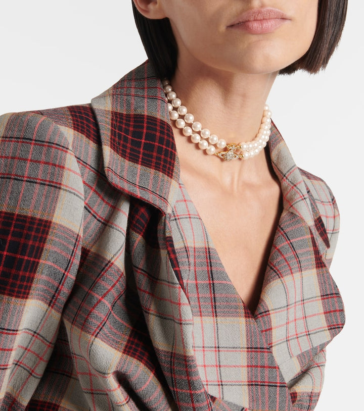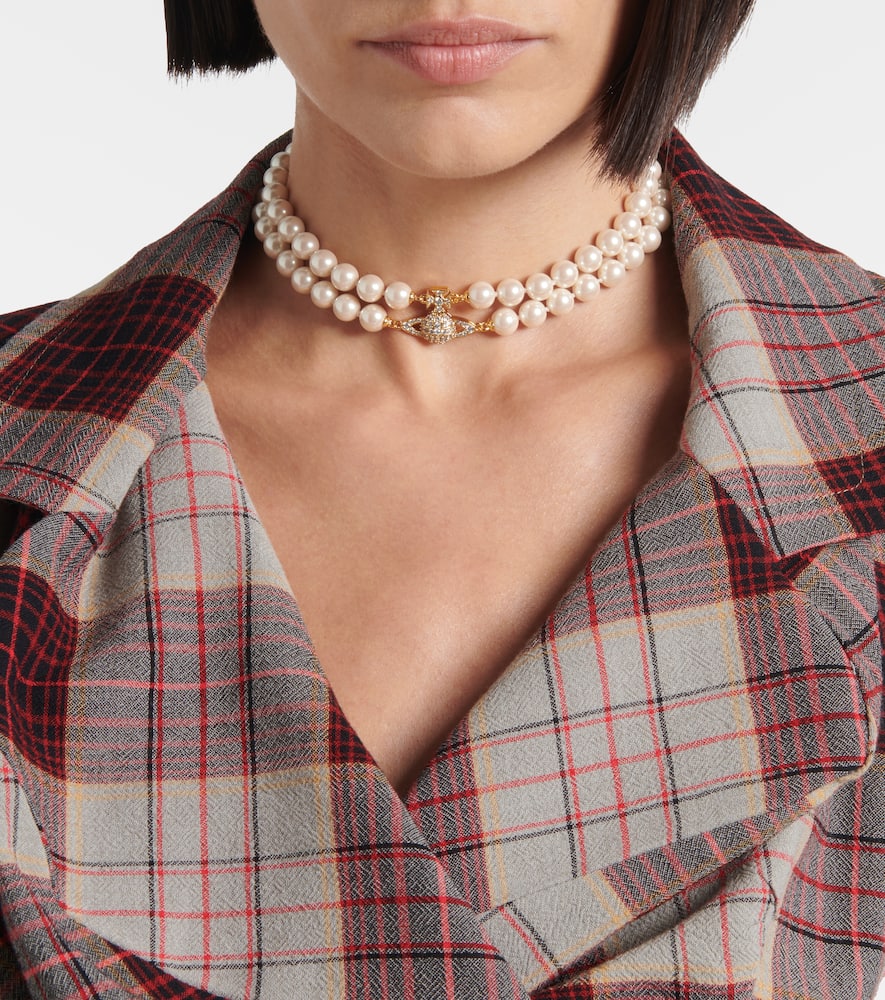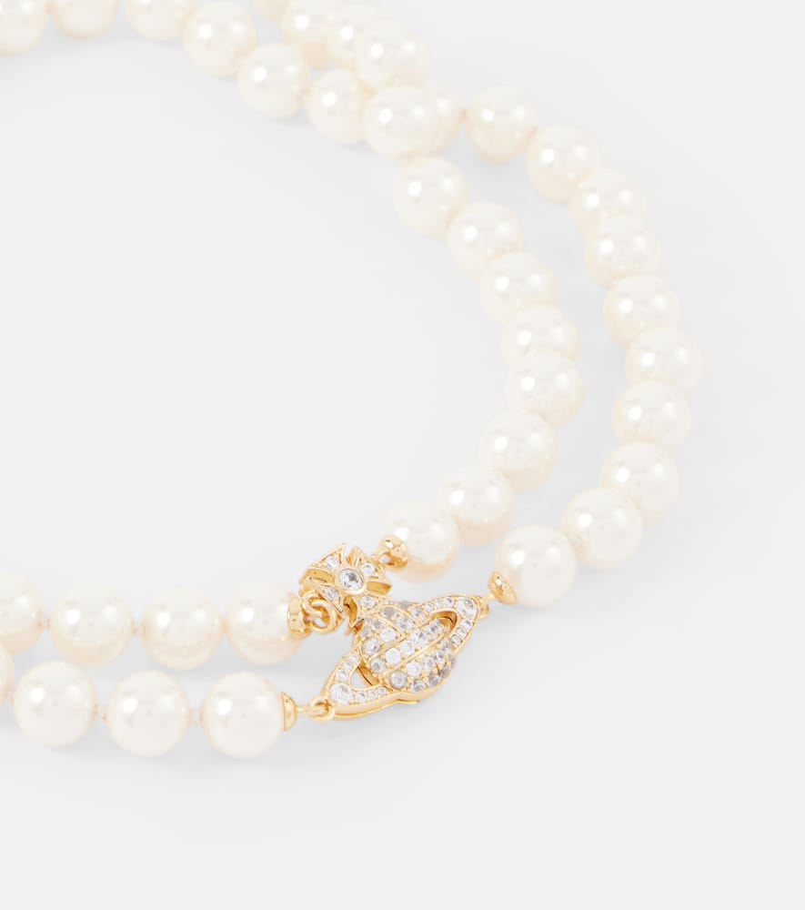 This Graziella Embellished Choker by Vivienne Westwood fuses classic elegance with contemporary charm. Adorned with faux pearls along a sleek brass frame, it conveys understated luxury and is ideal for layering or as a standout statement piece.