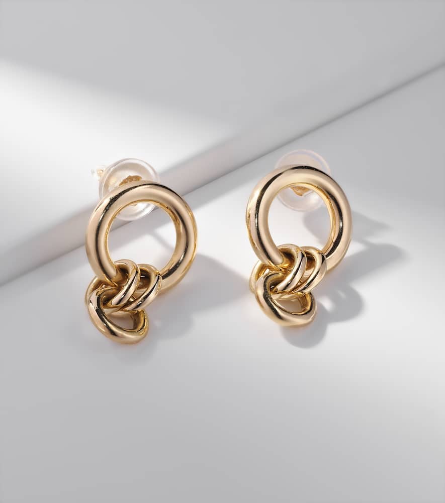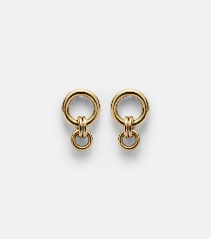 These Canis 18kt Gold Drop Earrings by Spinelli Kilcollin are sculptural and bold, featuring smooth yellow gold forms that convey modern sophistication and luxury. Perfect for statement-making elegance in any setting.