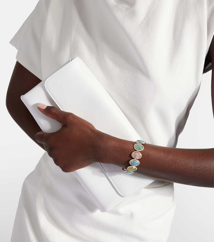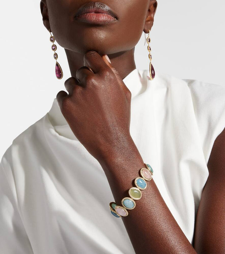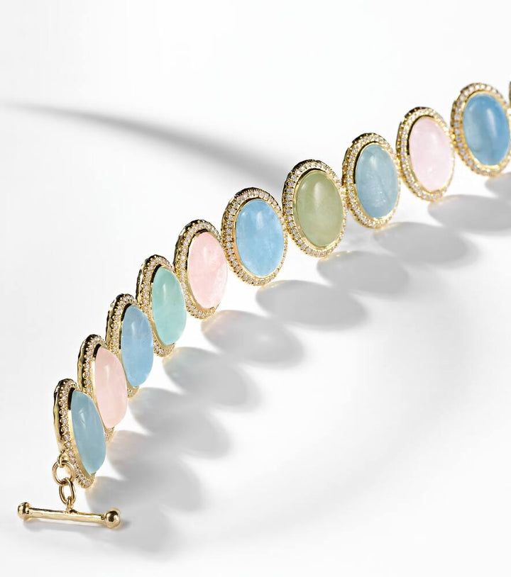This Front Street 18kt Gold Bracelet with Beryls and Diamonds by Octavia Elizabeth exudes artisanal sophistication. The soft cabochon beryls paired with pavé diamonds create a luminous, pastel-hued composition, symbolizing renewal, elegance, and refinement. Its substantial width and toggle clasp make it a statement piece, perfect for layering or wearing solo.