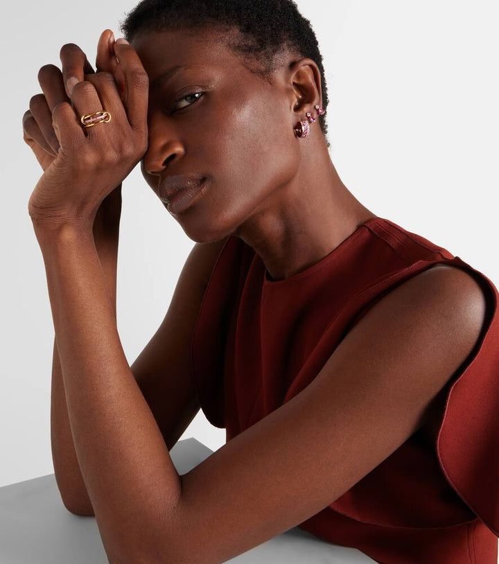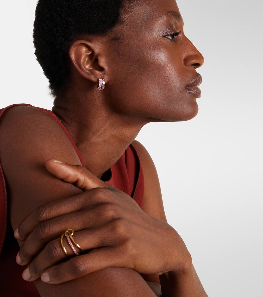 These Lola 18kt Rose Gold Hoop Earrings with Diamonds and Sapphires by Anita Ko radiate playful luxury. The combination of pink sapphires and pavé-set diamonds evokes elegance and vibrancy, while the rose gold hoops offer a versatile yet bold statement, perfect for elevating any ensemble.
