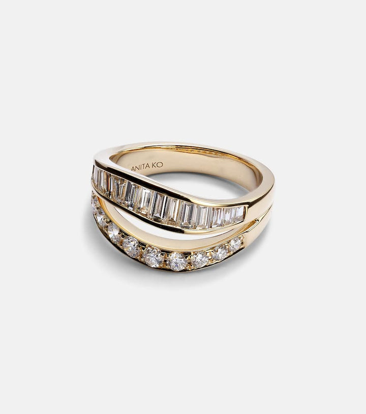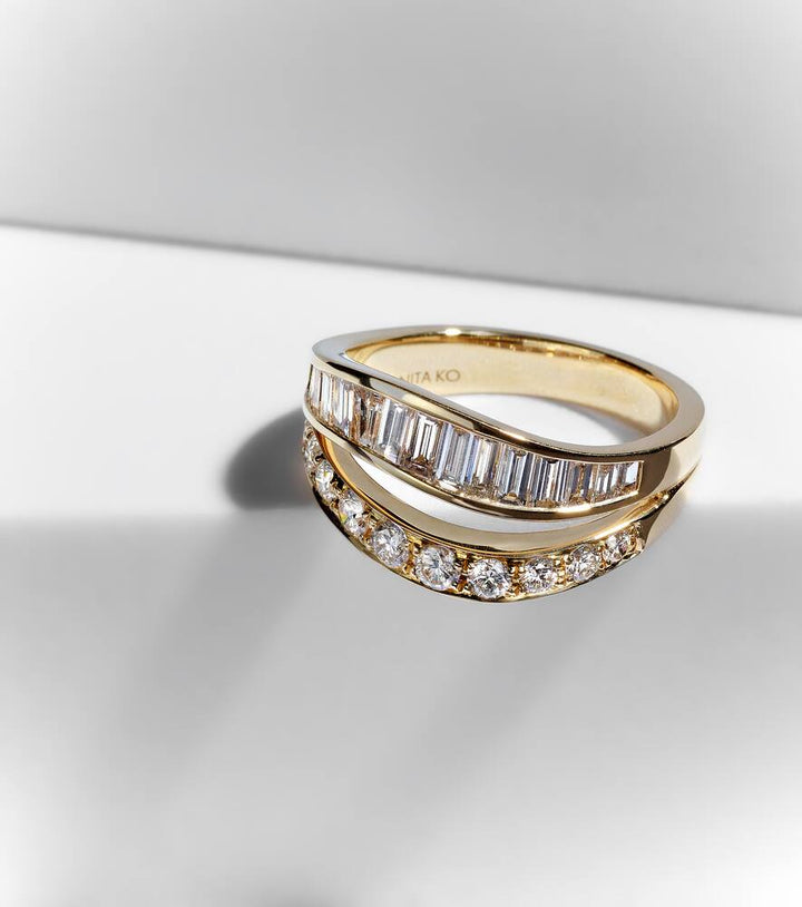 This 18kt Gold Ring with Diamonds by Anita Ko is a sophisticated display of geometric brilliance. The combination of pavé-set round diamonds and channel-set baguette diamonds creates a striking balance of light and structure, perfect for stacking or as a statement ring.