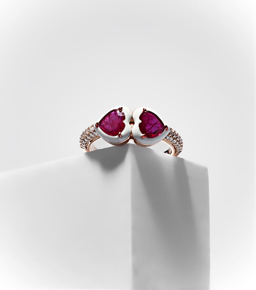This 18kt Rose Gold Ring with Rubies and Diamonds by Kamyen is a vibrant statement of love and luxury. The heart-shaped ruby centerpiece complemented by pavé diamonds embodies romance and refined craftsmanship, ideal as a standout pinky ring.