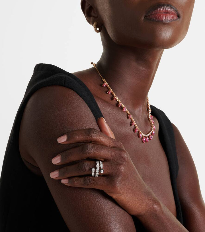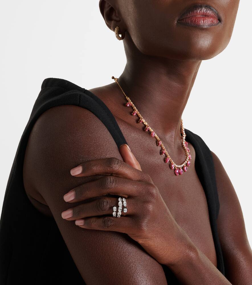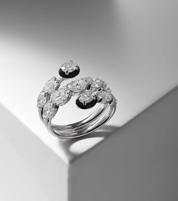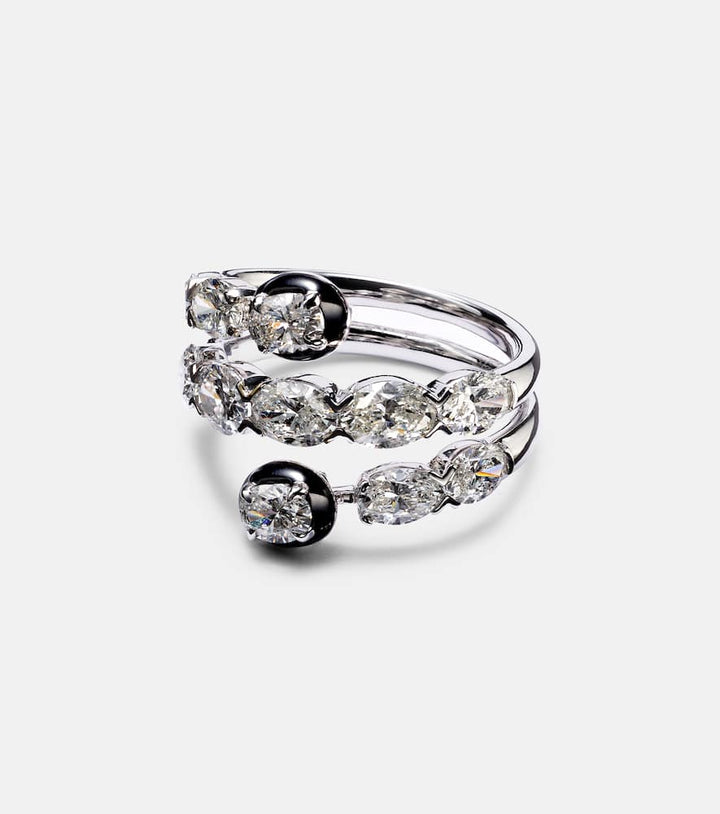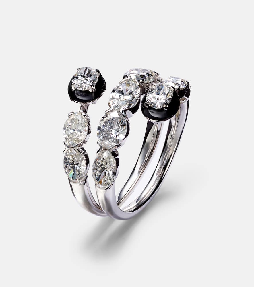 This 18kt White Gold and Enamel Ring with Diamonds by Kamyen is an opulent showcase of high jewelry artistry. The oval-cut diamonds set in prong and bezel settings create dazzling brilliance, while enamel details enhance the modern aesthetic.
