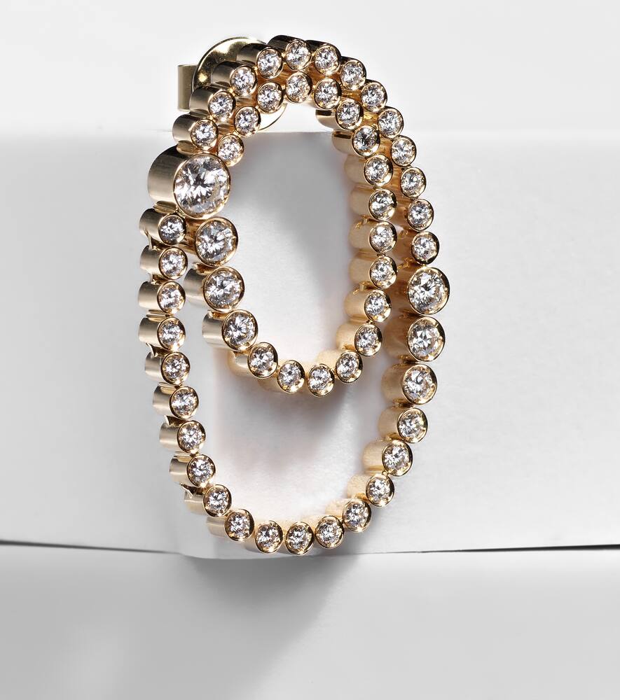 This Embrassée de Diamant 18kt Gold Single Earring with Diamonds by Sophie Bille Brahe showcases modern luxury with architectural elegance. The bezel-set round diamonds offer brilliant sparkle, symbolizing refinement and high jewelry craftsmanship.