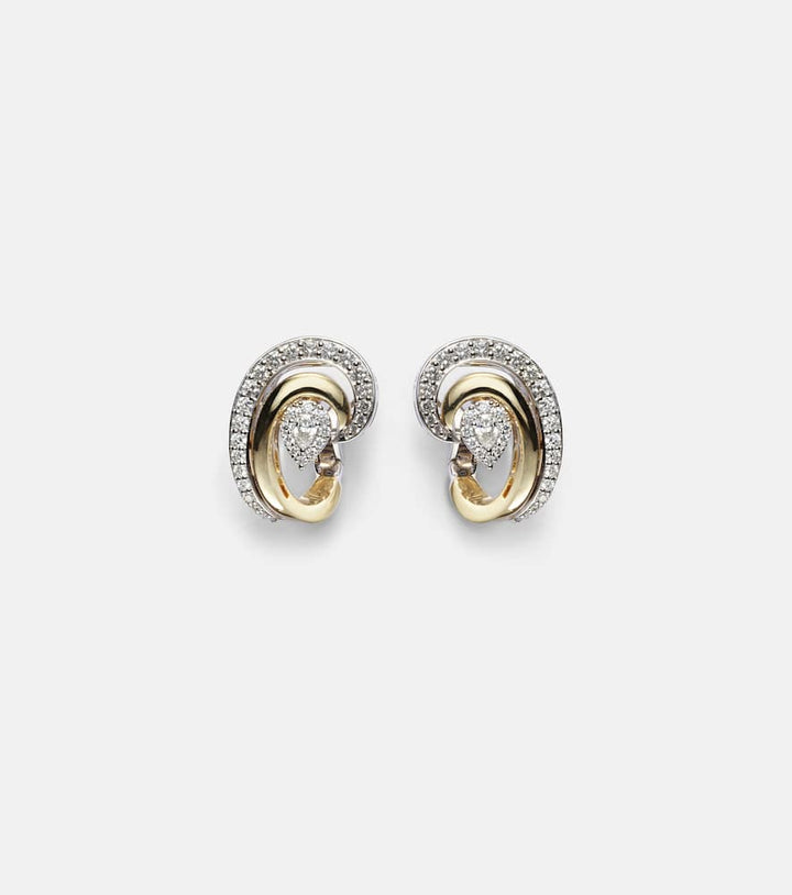 These Golden Strada 18kt Yellow and White Gold Earrings with Diamonds by Yeprem offer modern elegance with layered sparkle. Round and pear-shaped diamonds create a delicate, refined shine suitable for versatile styling.