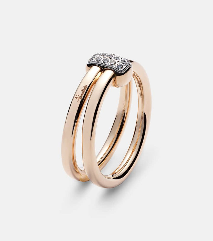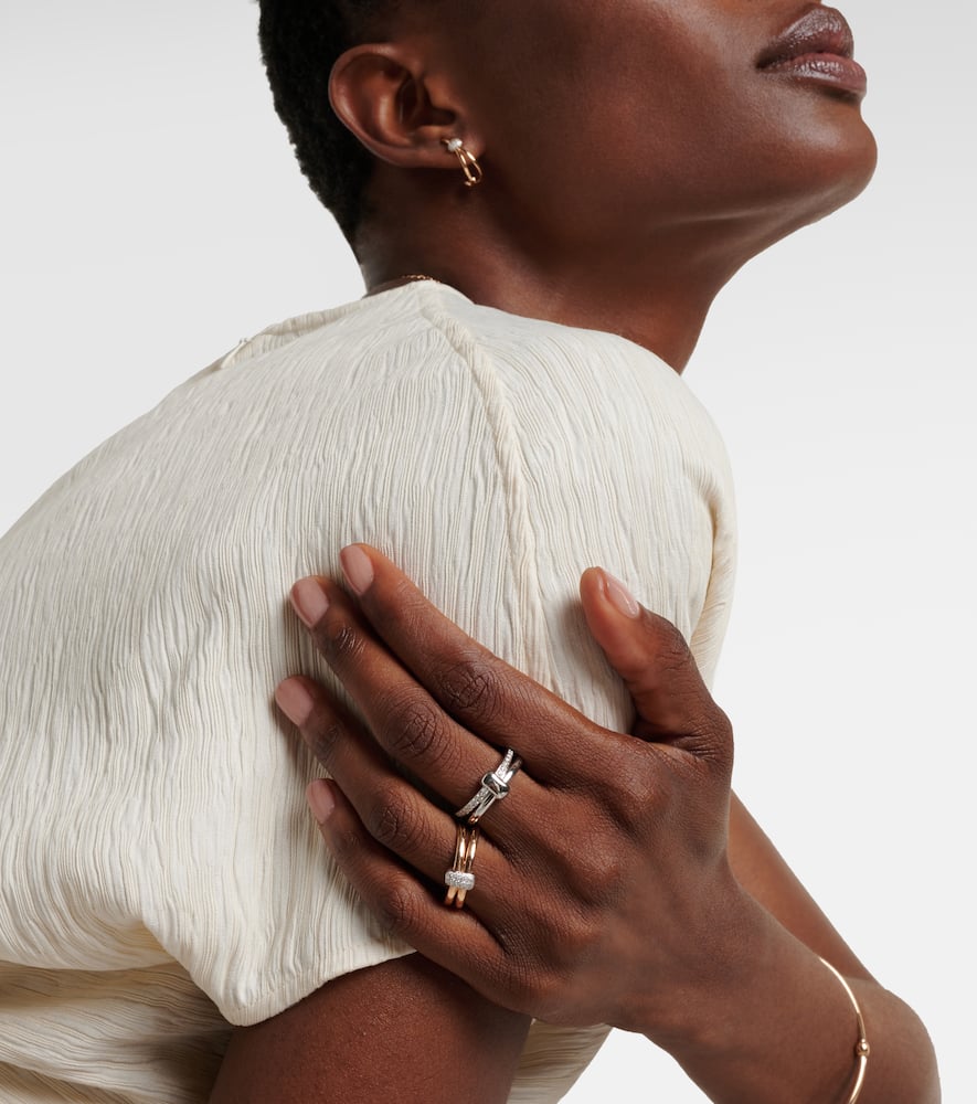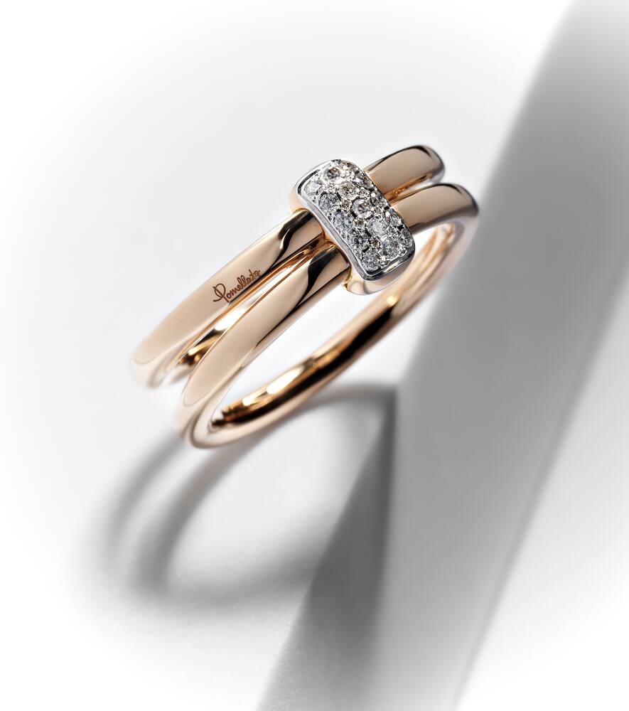This Pomellato Together Rose Gold Ring by Pomellato combines warmth and brilliance, with 15 pavé-set diamonds totaling 0.1ctw delicately accenting the rhodium-plated rose gold band. Its sleek design offers timeless femininity and versatility.