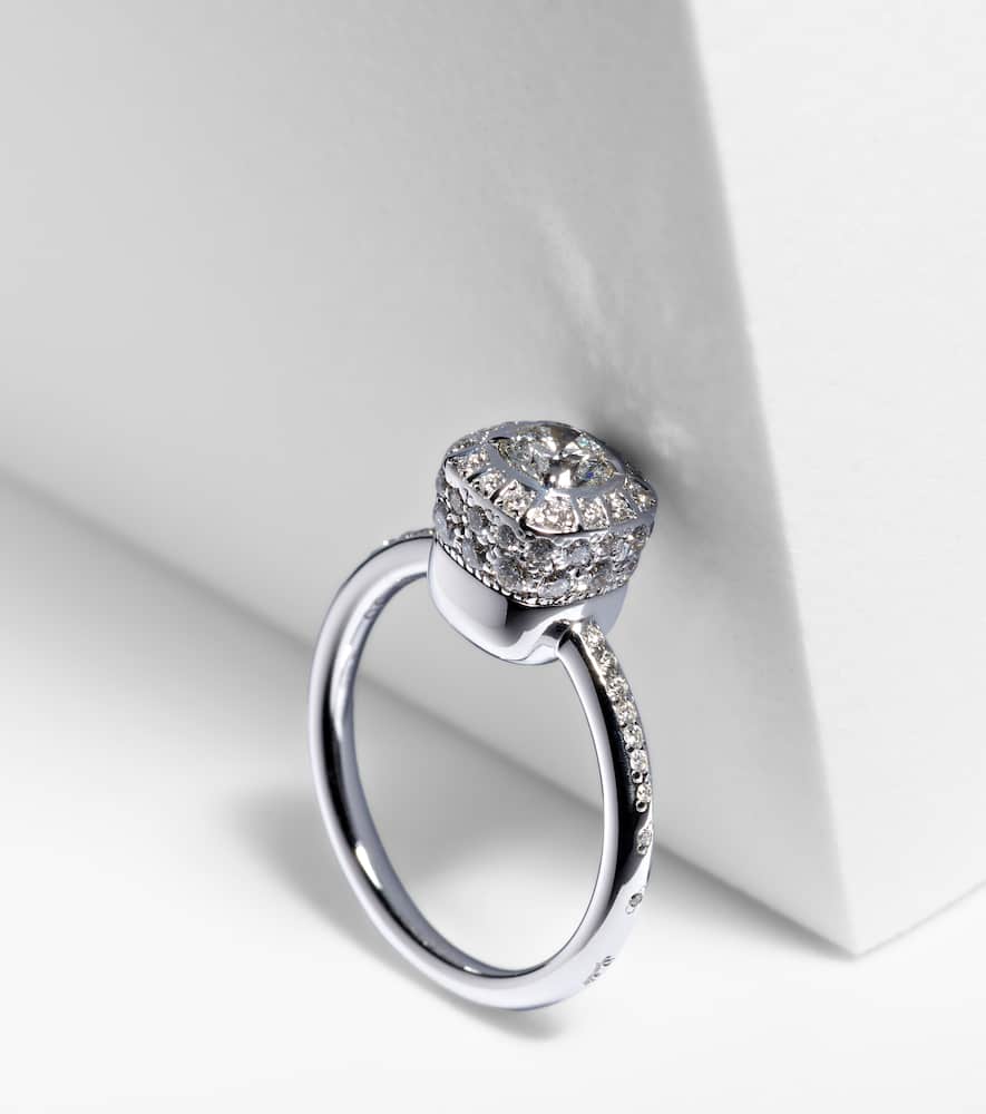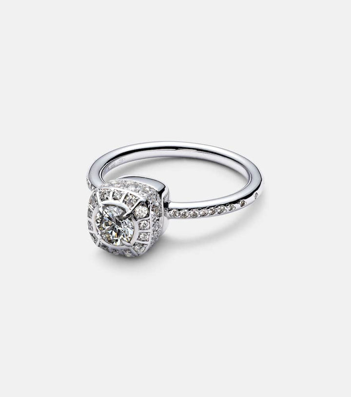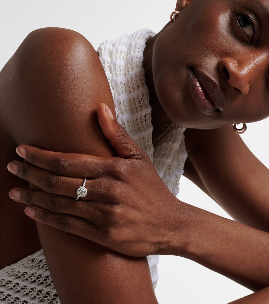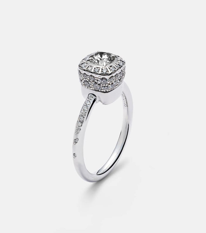 This Nudo Petit White Gold Ring by Pomellato is a minimalistic celebration of light, featuring a central 0.5ct round diamond surrounded by 61 smaller diamonds totaling 0.8ctw, symbolizing purity and timeless elegance.