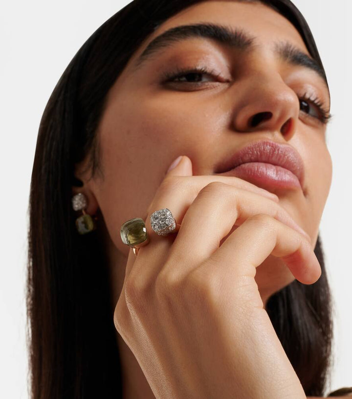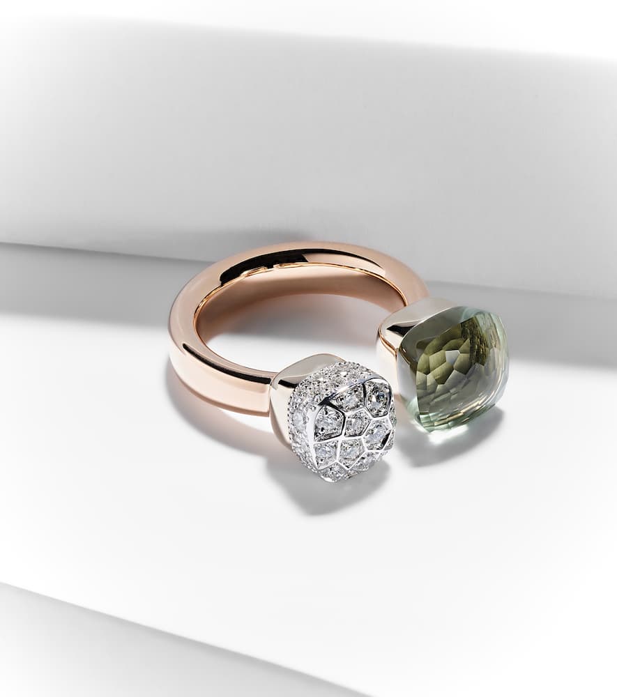 This Nudo Ring in Rose and White Gold with Diamonds and Prasiolite by Pomellato blends soft green prasiolite with pavé-set diamonds, creating a striking balance of color, sparkle, and contemporary elegance.