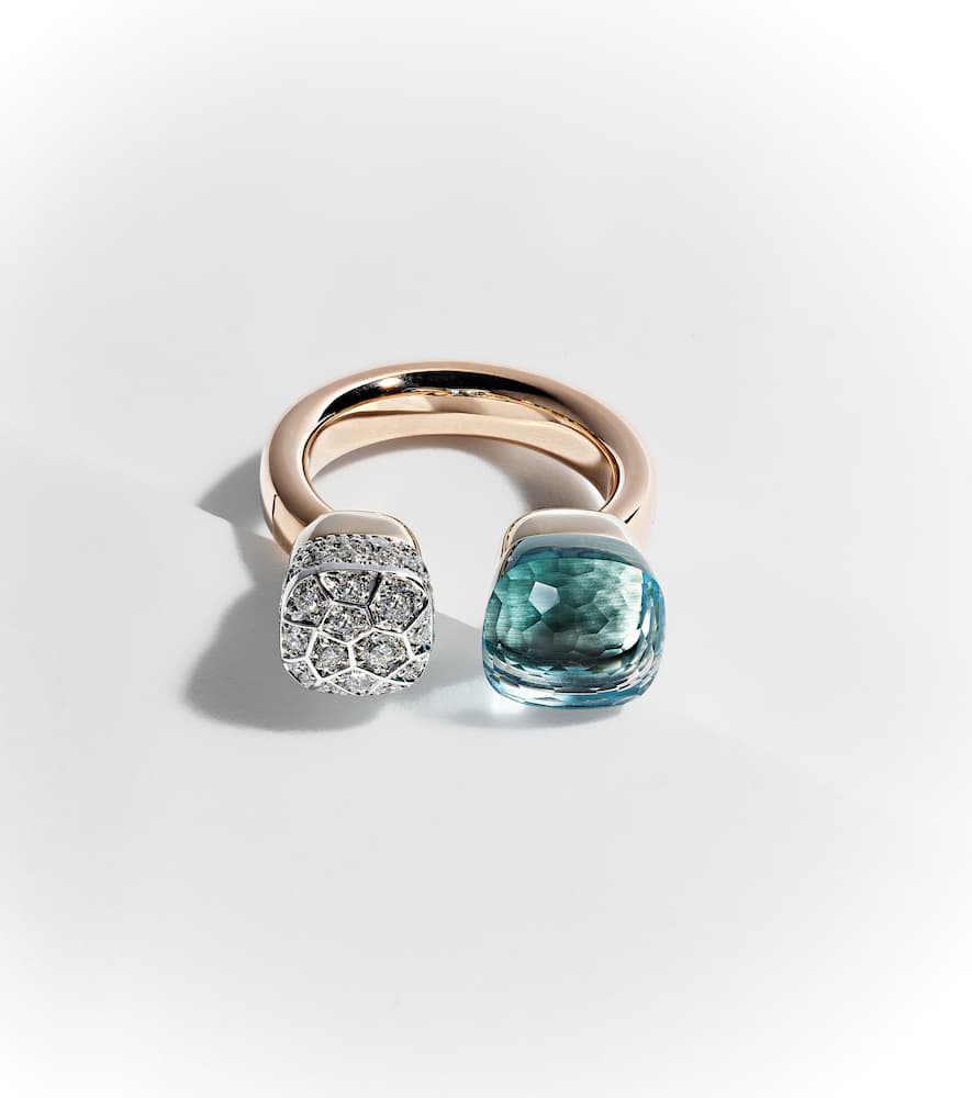 This Nudo Ring in Rose and White Gold with Topaz and Diamonds by Pomellato features a brilliant 9ct blue topaz surrounded by 39 pavé-set diamonds totaling 0.8ctw, creating a luxurious, modern statement.
