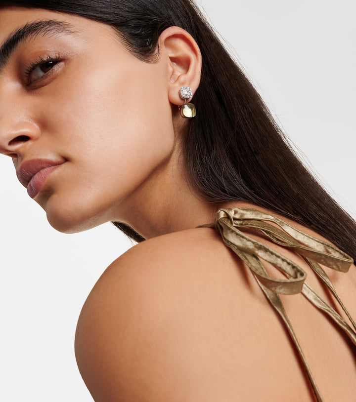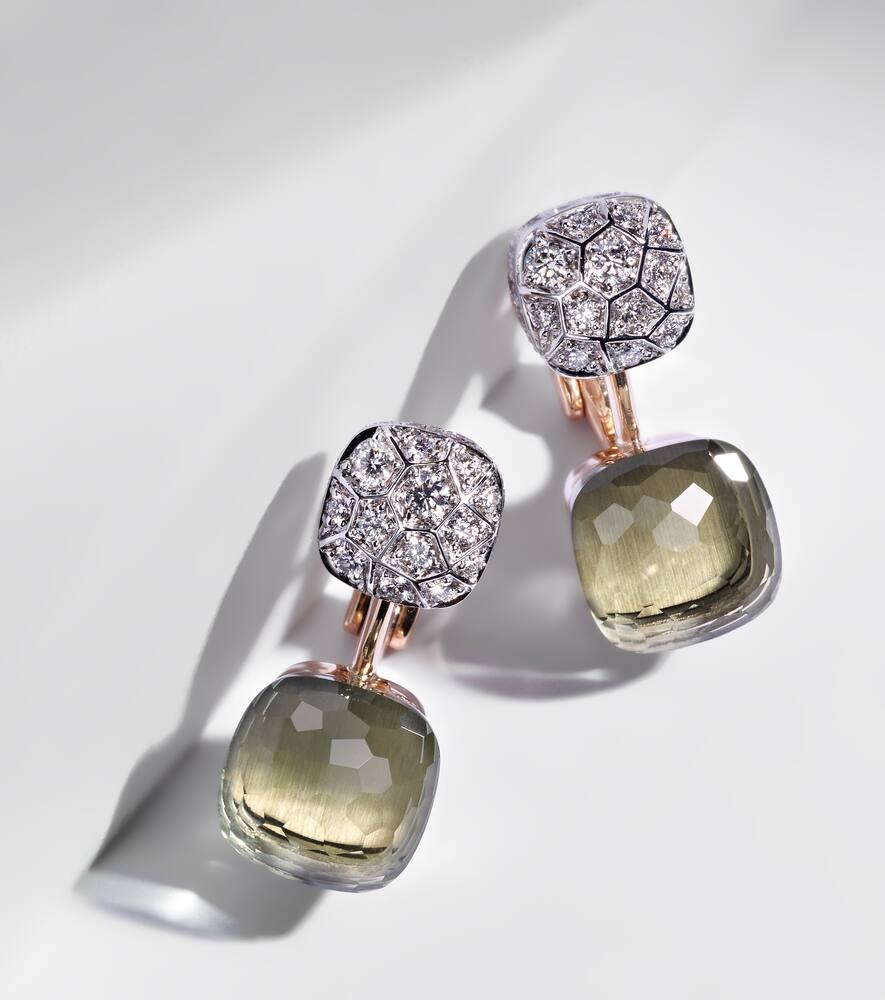 These Nudo Earrings with Prasiolites and Diamonds by Pomellato combine 14ctw rose-cut prasiolites with 76 pavé-set diamonds totaling 1.5ctw, offering a striking duo of color and sparkle in a contemporary design.