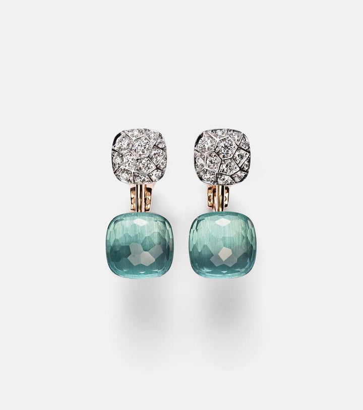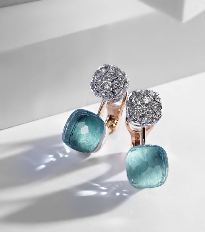These Nudo Earrings with Topaz and Diamonds by Pomellato feature 18ct brilliant-cut blue topaz paired with 76 pavé-set diamonds totaling 1.5ctw, creating a luminous and modern statement for the ears.