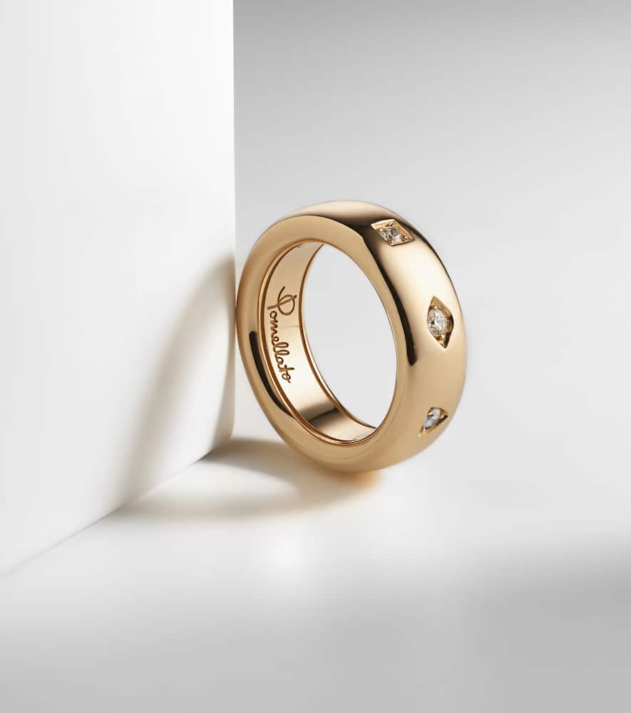 This Iconica Ring with Diamonds in 18kt Rose Gold by Pomellato combines subtle sparkle with modern design, featuring three round-cut diamonds totaling 0.1ctw. Perfect for adding a refined shimmer to everyday or formal looks.