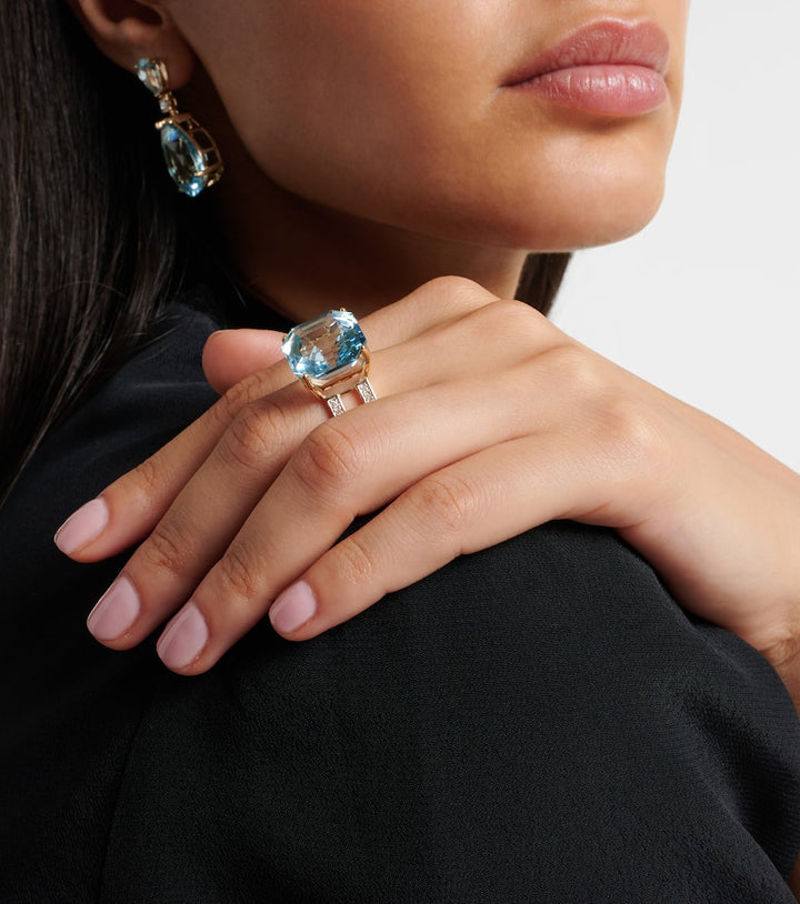 This Ring with Blue Topaz and Diamonds by Mateo in 14kt Yellow Gold combines a central asscher-cut blue topaz 21.65ct with pavé-set diamonds totaling 0.252ct, creating a luminous, elegant design.