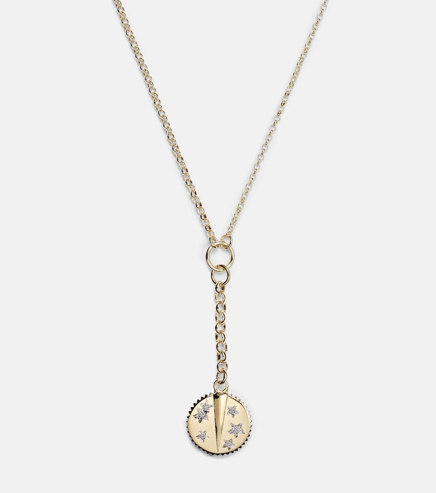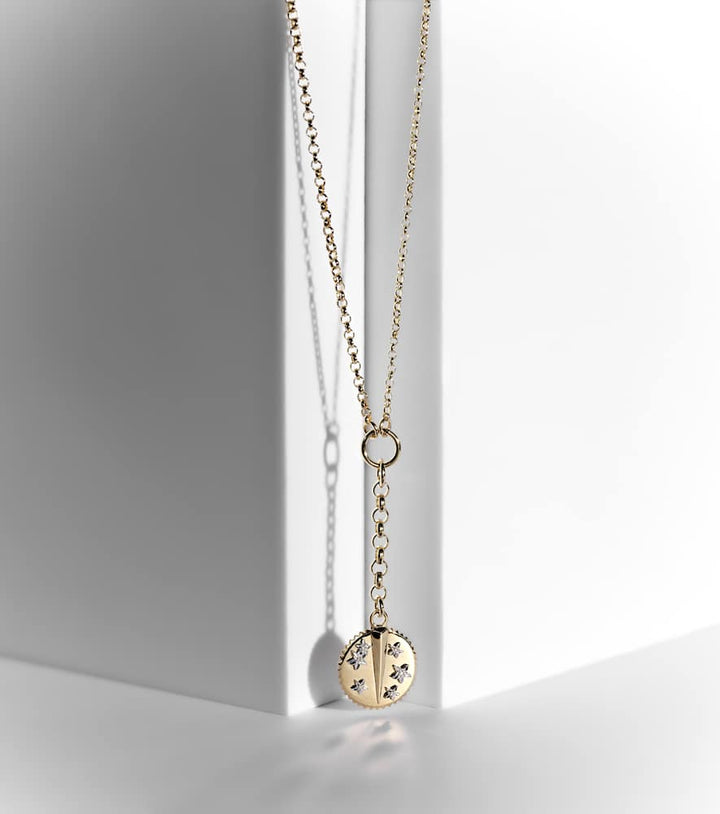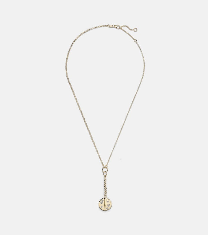 18kt yellow gold with 0.023ct pavé-set VS1 round diamonds. Adjustable length 41–46cm; chain width 1–2mm; pendant measures 55mm height × 16mm width. Lobster-clasp fastening.