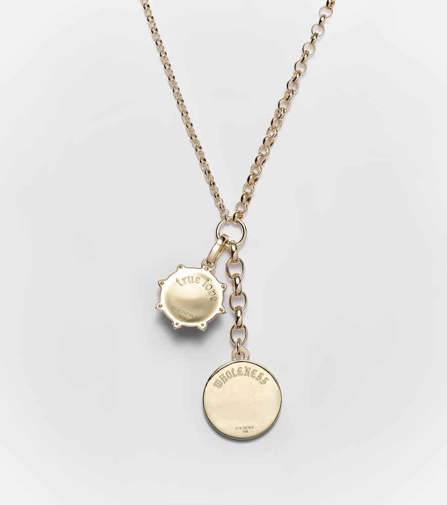 This FoundRae Wholeness & True Love 18kt gold charm necklace with diamonds by FoundRae celebrates completeness and affection, featuring a polished charm accented with sparkling diamonds. Its symbolic design makes it perfect for everyday wear or special occasions.