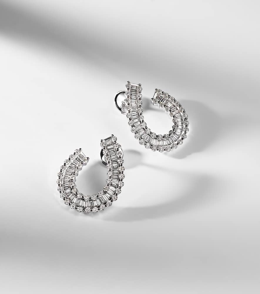 These 18kt White Gold Earrings by Bucherer Fine Jewellery showcase timeless sophistication, featuring a combination of baguette and brilliant-cut diamonds that create a luxurious interplay of brilliance. Designed to reflect elegance and opulence, they are perfect for formal events or as a statement of refined taste.