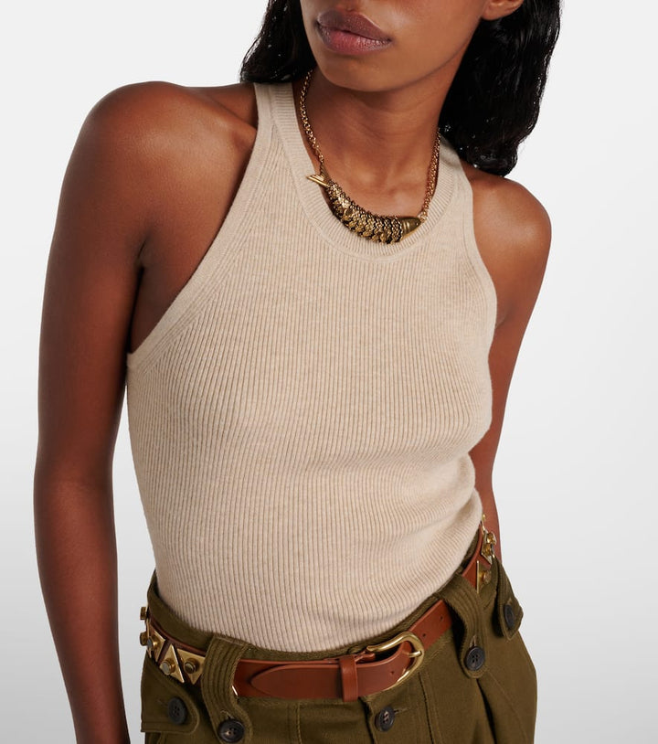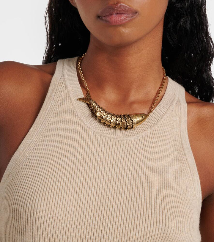 This River Choker by Isabel Marant is a minimalist, versatile piece with a slender brass pendant that adds understated elegance. Designed to enhance casual and elevated looks alike, it evokes modern sophistication.