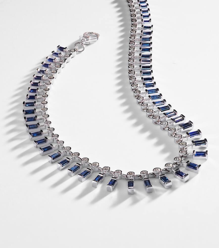 Handcrafted in 18kt white gold with 8.81ct baguette-cut sapphires in bar setting and 1.22ct round-cut bezel-set diamonds. Adjustable length 29.5–36 cm (11.5–14 inches), chain width 9–11 mm (0.35–0.45 inches).