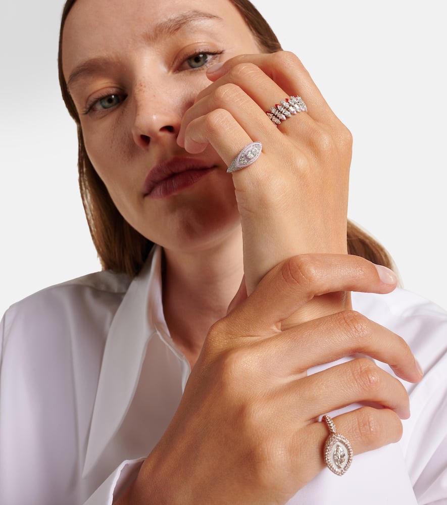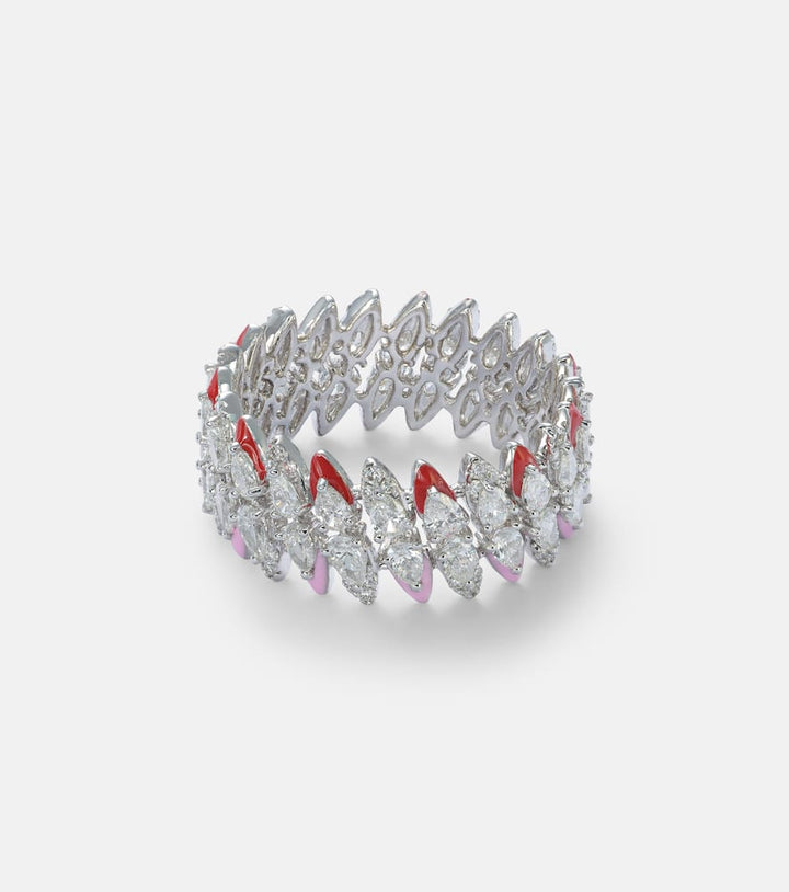 This White Gold and Enamel Ring by Kamyen displays a vibrant palette of pink and red enamel paired with diamonds totaling 8.74ct, creating a striking, modern aesthetic with an artistic flair.