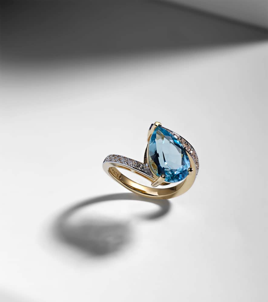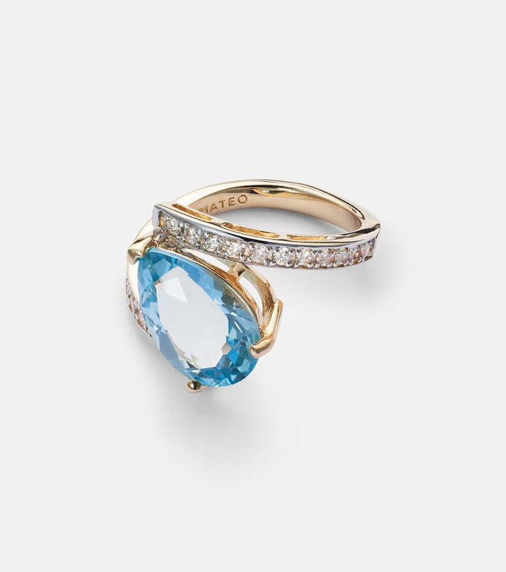 This Slanted Ring by Mateo features 14kt yellow gold with pear-shaped blue topaz and round-cut diamonds, offering a modern, asymmetric design with bold color and sparkle.