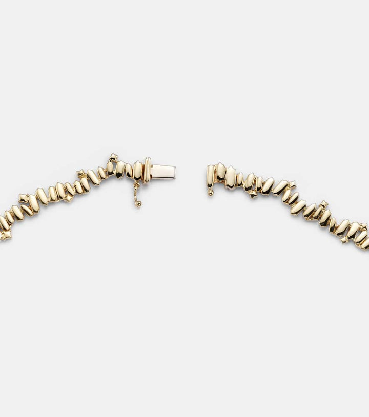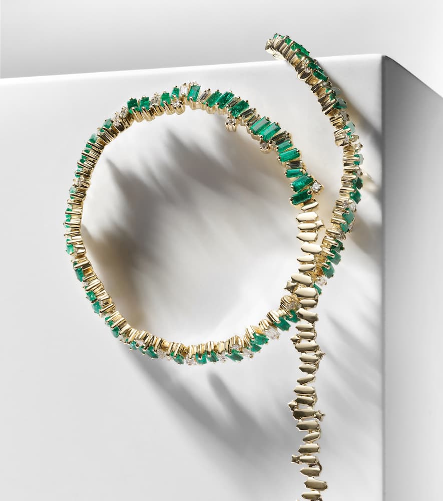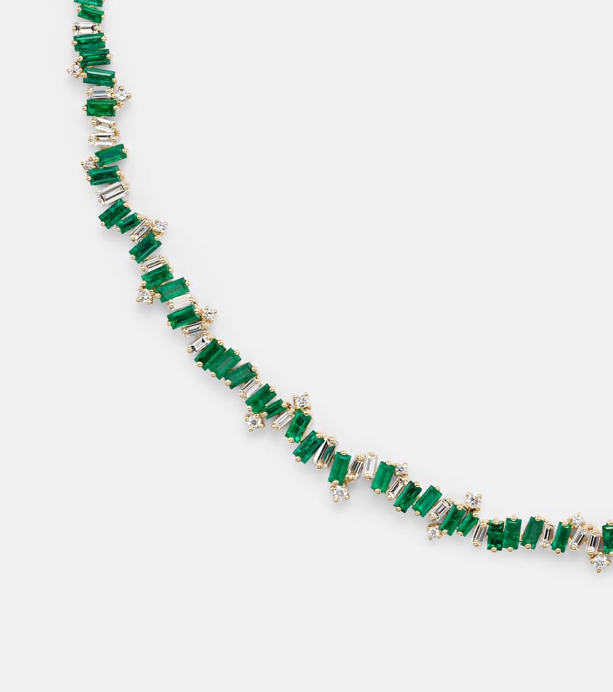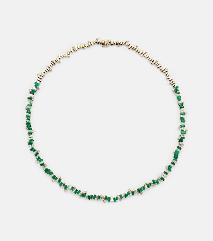This Bold Burst Necklace by Suzanne Kalan is a vibrant statement in 18kt yellow gold, combining round and baguette-cut diamonds with emeralds for a dynamic, luxurious effect.