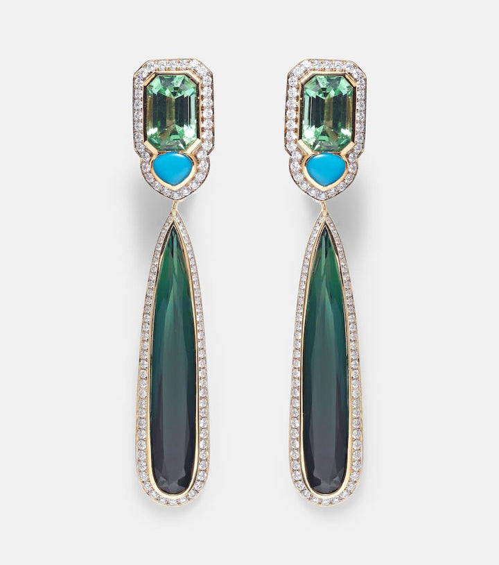 These Earrings by Marina B Quarta combine 18kt yellow gold with a mix of emerald- and cabochon-cut tourmalines, turquoise, and pavé-set diamonds totaling 1.39ct, creating a vibrant, colorful, and luxurious design.
