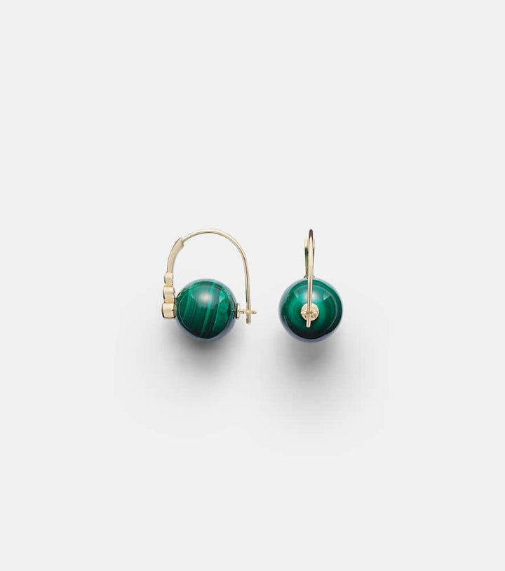 Handcrafted in 14kt yellow gold with 6 diamonds totaling 0.22ct and malachite stones. Length 20 mm (0.8 inches), maximum width 11 mm (0.45 inches), diameter 13 mm (0.5 inches). Hook fastening for pierced ears.