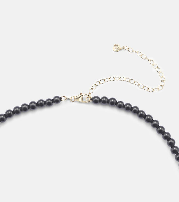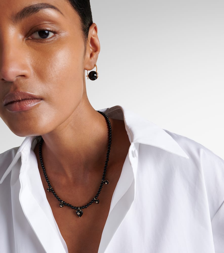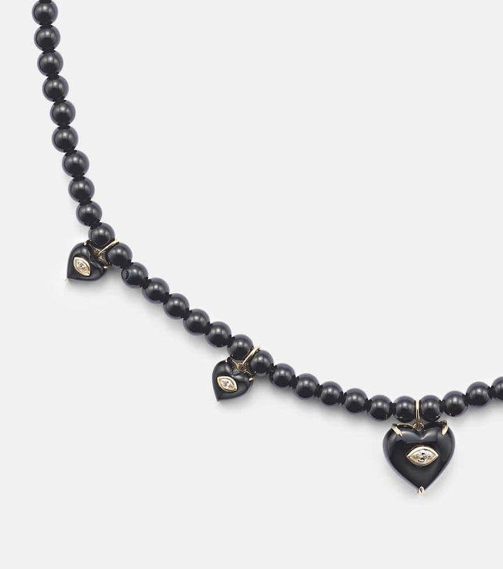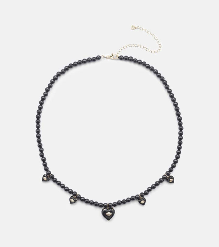 Carved Heart 14kt gold beaded necklace with diamonds and onyx