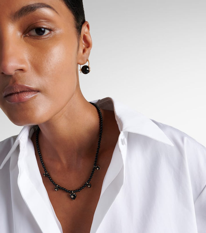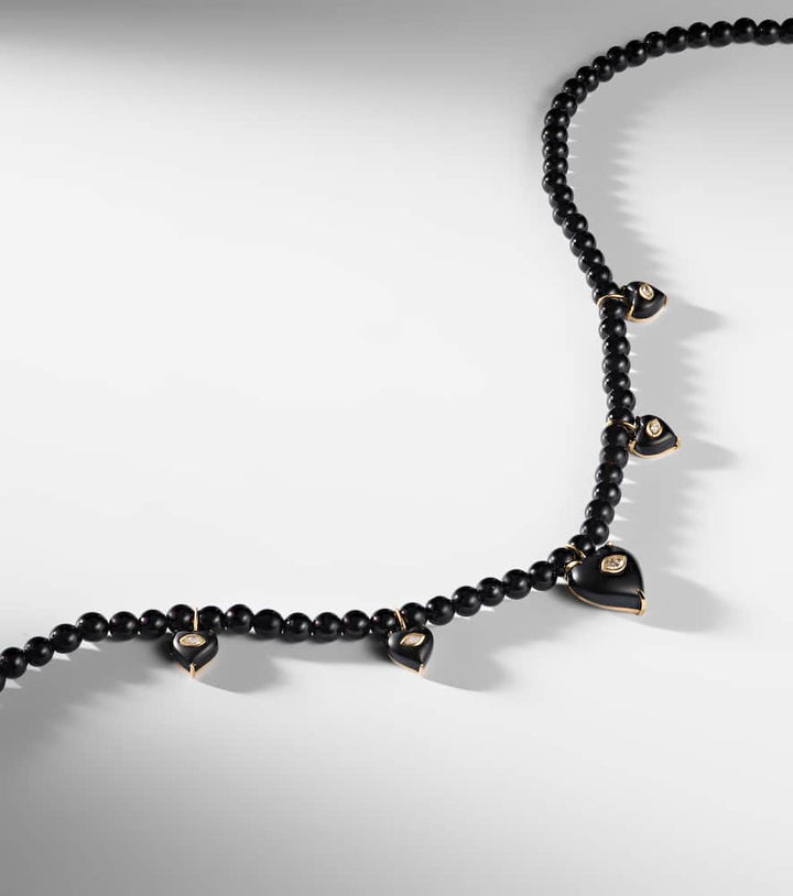 This Carved Heart Beaded Necklace by Sydney Evan combines 14kt yellow gold with onyx and diamonds, offering a striking contrast of color and sparkle in a playful, sculptural design.