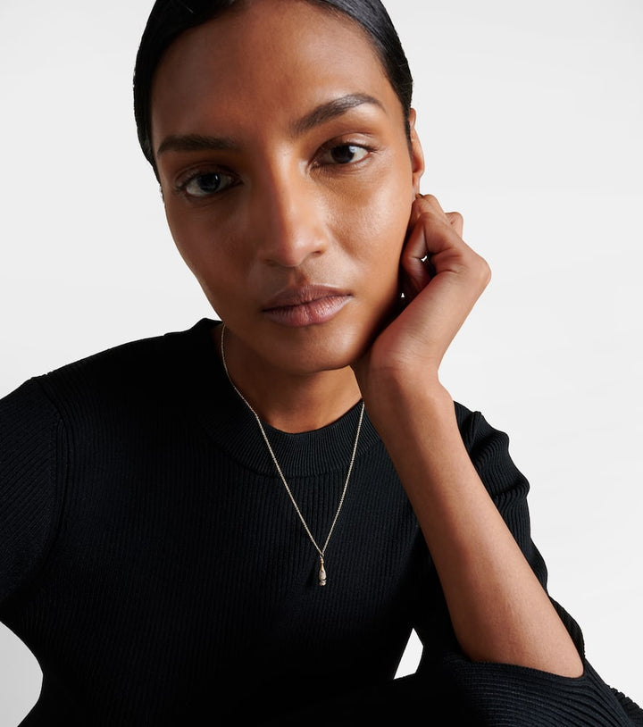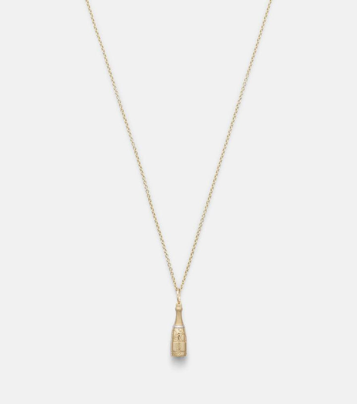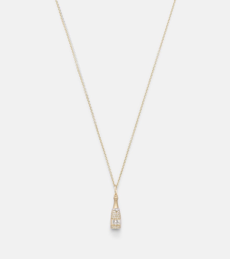 This Champagne Bottle Pendant Necklace by Sydney Evan is a whimsical 14kt yellow gold piece with pavé diamonds, combining fun and luxury for a standout, playful accessory.