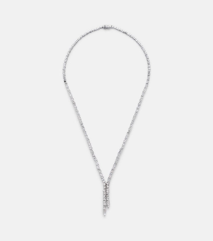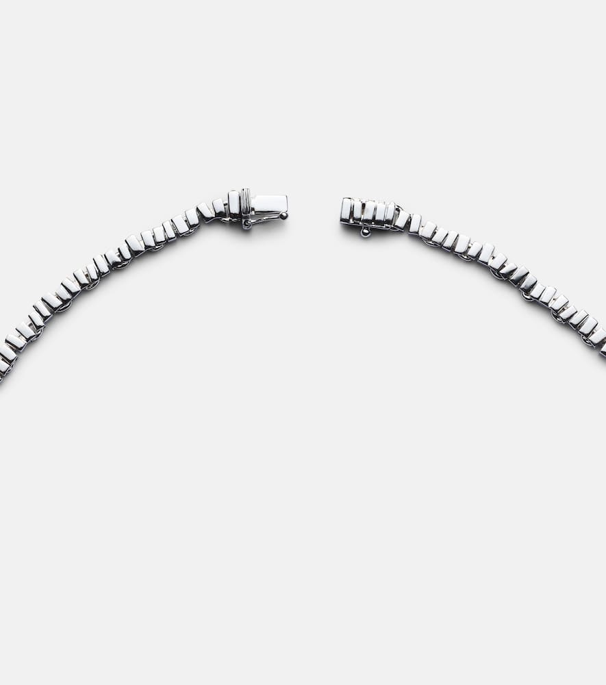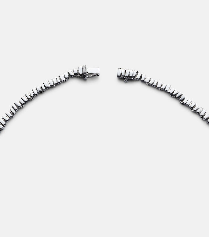 Handcrafted in 18kt white gold with 181 baguette-cut diamonds totaling 5.50ct. Length: 45 cm (17.5"); min width 4 mm (0.15"). Box clasp with safety latch. Made in the USA.