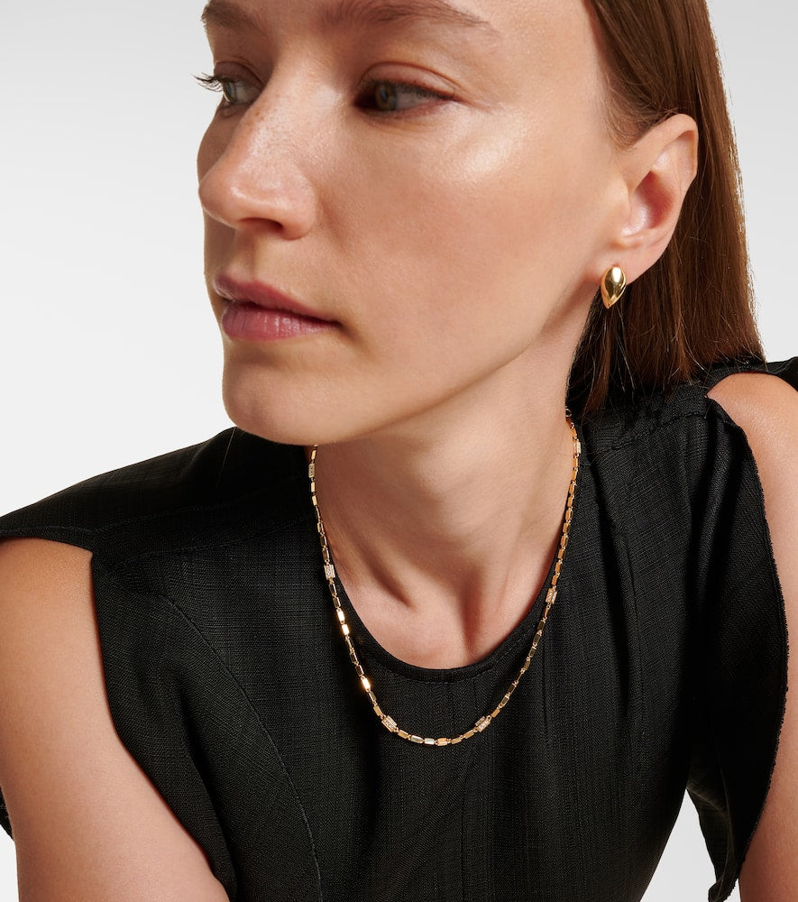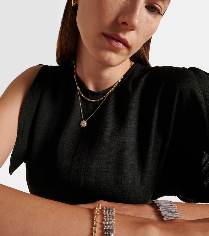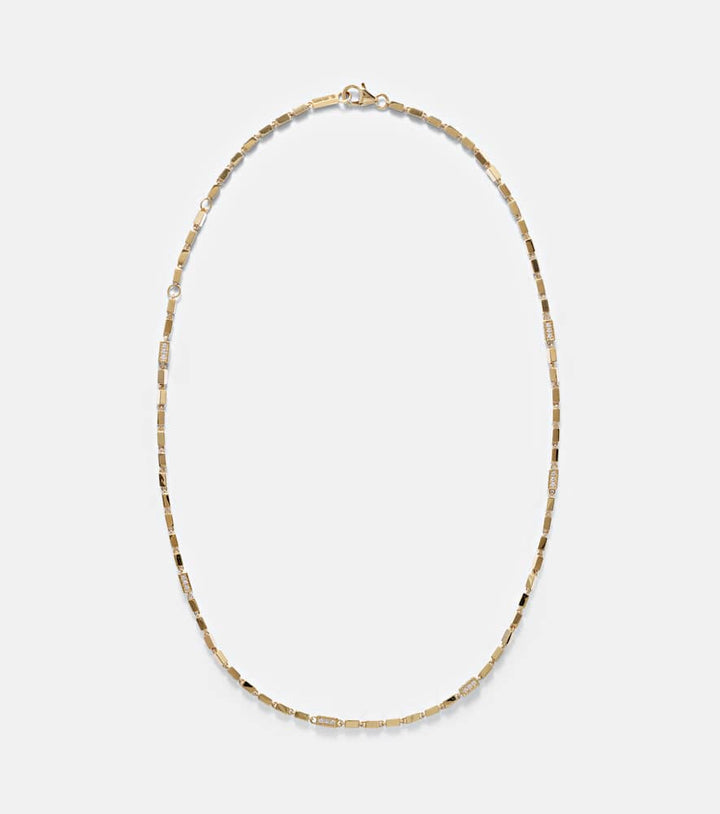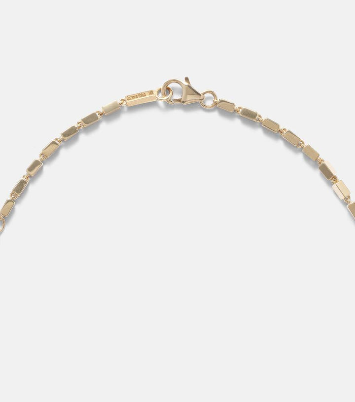 This Suzanne Kalan Yellow Gold Necklace with Diamonds by Suzanne Kalan embodies modern sophistication with luminous detail. Featuring 72 round-cut pavé-set diamonds totaling 0.85ct, the adjustable necklace balances minimalist elegance with exquisite sparkle. The piece symbolizes love, refinement, and contemporary luxury, reflecting Suzanne Kalan’s dedication to precision craftsmanship. Ideal for layering or wearing solo, its versatile design complements any wardrobe while offering a subtle yet striking statement. Every diamond placement enhances the piece’s brilliance, making it an enduring symbol of style, elegance, and meaningful fine jewelry.