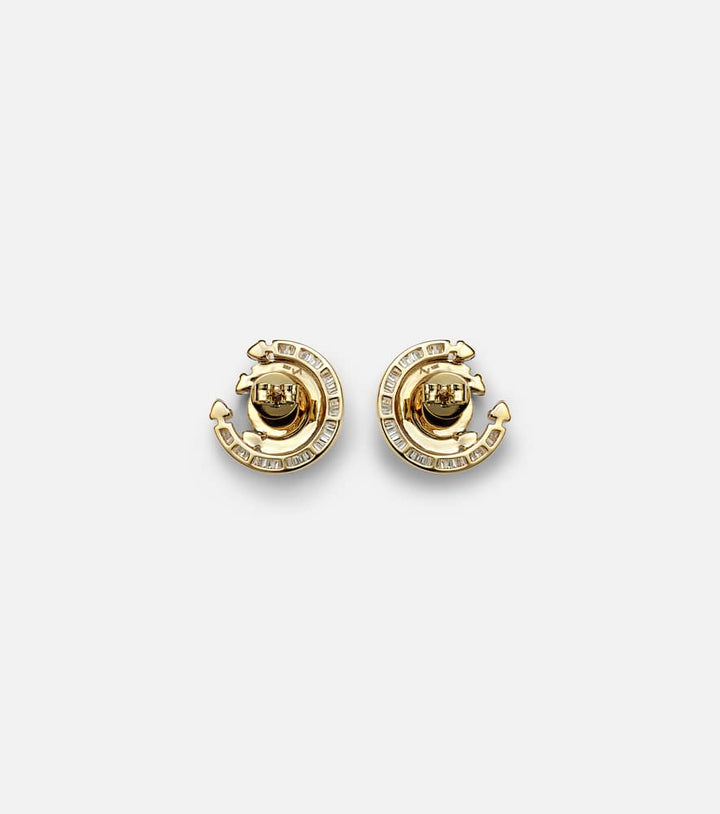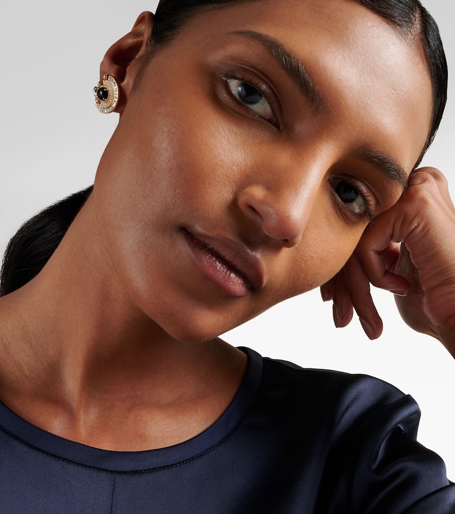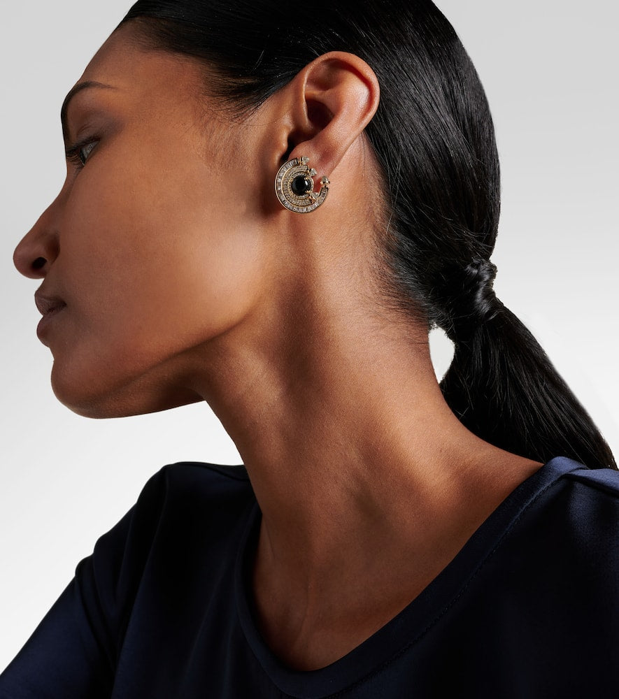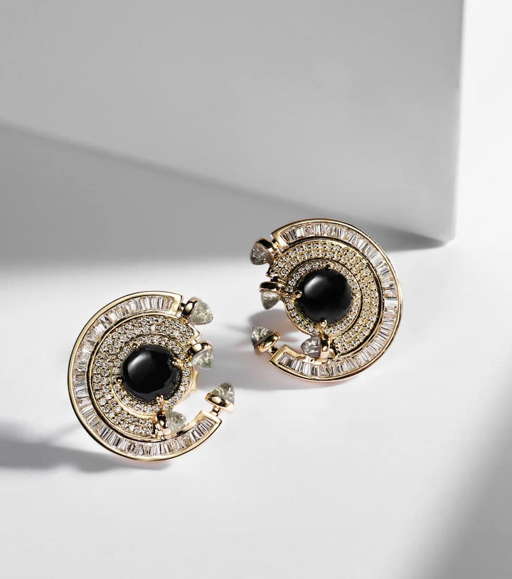 These Ananya Chakra Earrings by Ananya blend striking gemstones with sparkling diamonds for a captivating 18kt yellow gold design. Featuring 2.97ct of round-cut onyx, 1.20ct of round-cut pavé diamonds, and 0.95ct of baguette-cut crystals, they create a layered, dynamic silhouette that embodies balance, protection, and elegance. Their polished craftsmanship ensures each stone’s brilliance is highlighted, making them ideal for statement wear. Reflecting Ananya’s commitment to intricate design and contemporary artistry, these earrings convey both symbolic meaning and luxurious style, offering a versatile accessory that elevates formal or everyday ensembles with radiant sophistication.