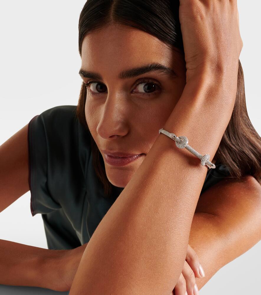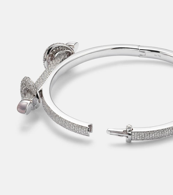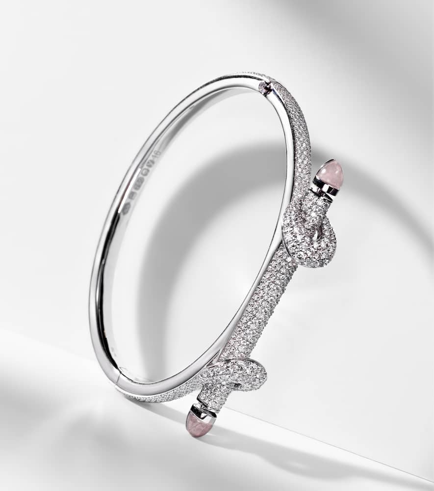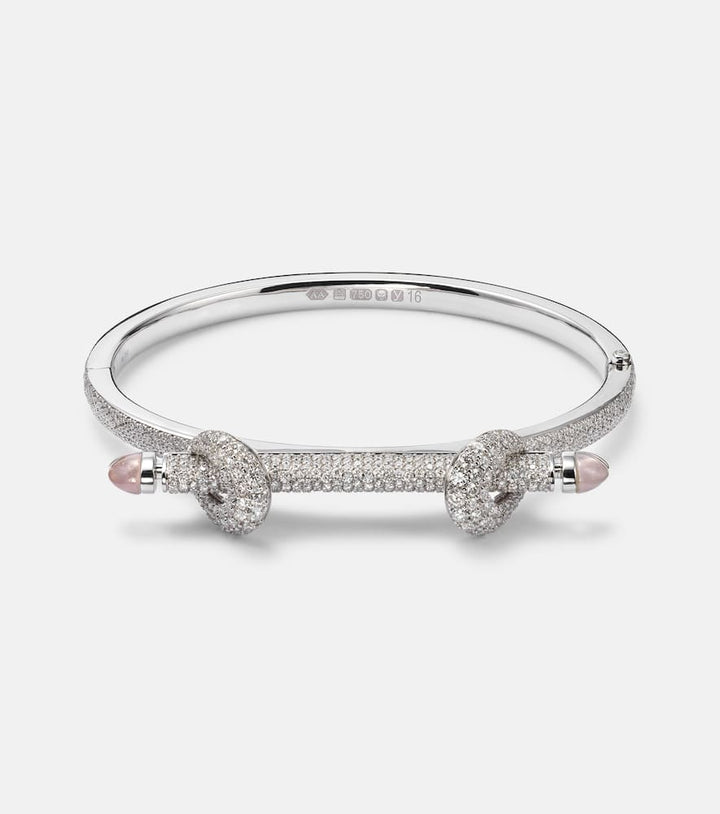 Handcrafted in 18kt white gold with 946 brilliant-cut diamonds totaling 4.46ct and pavé-set quartz crystals 9.64ct. Max width 11 mm (0.45"); circumference 16 cm (6.5"). Made in the UK.