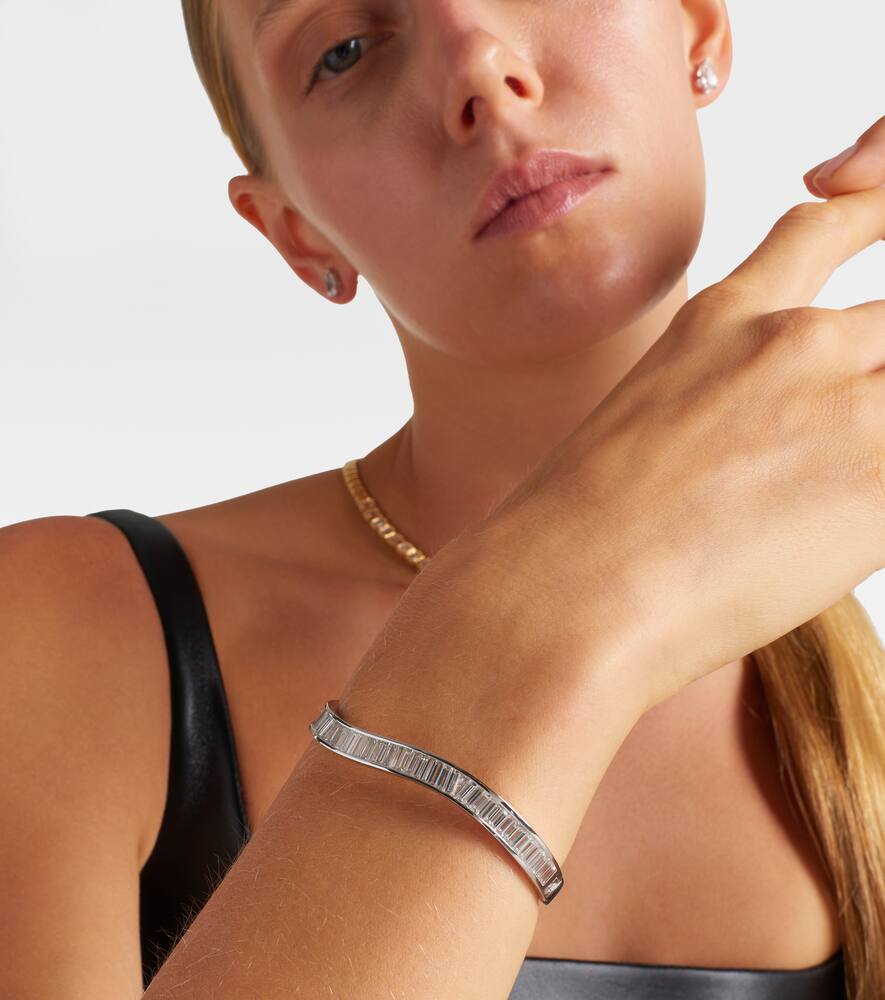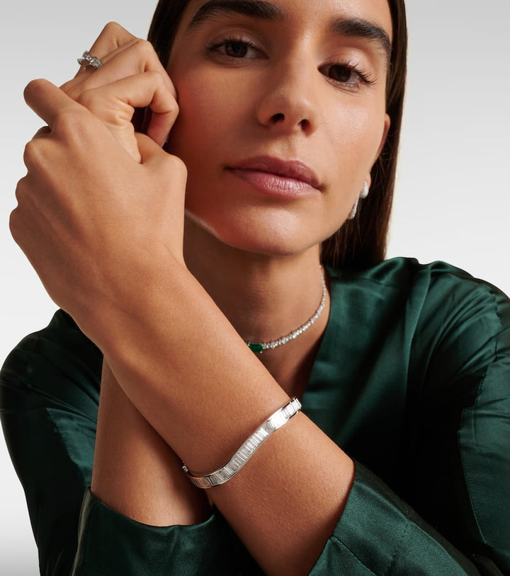 This Anita Ko Saturn Bracelet in 18kt White Gold embodies structured brilliance and timeless luxury. Featuring 5.38ct of VS clarity, G color, baguette-cut diamonds in a precise channel setting, it conveys architectural sophistication and luminous sparkle. The polished white gold band ensures comfort while enhancing each diamond’s radiance, making it ideal for statement wear or layering with other pieces. This bracelet exemplifies Anita Ko’s mastery of combining high craftsmanship with contemporary design, offering a versatile, eye-catching accessory that balances bold geometric style with subtle elegance for a modern, luxurious jewelry collection.