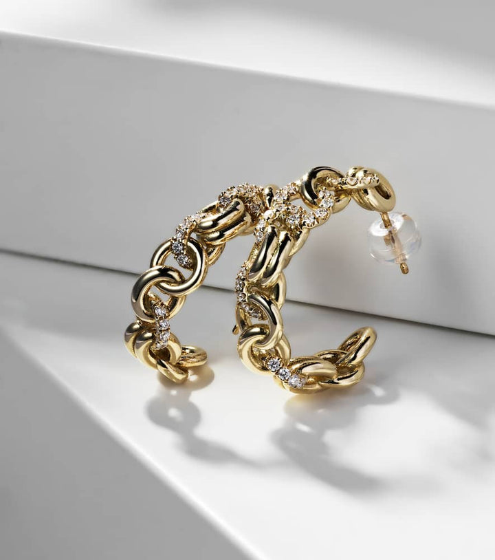 These Spinelli Kilcollin Fused Serpens Earrings in 18kt Yellow Gold feature pavé-set round-cut diamonds along a sculptural, serpentine design. Measuring 22mm in length and 6mm in width, they offer dramatic sparkle and modern architectural elegance. Perfect for statement wear or stacking with other earrings, they reflect Spinelli Kilcollin’s dedication to craftsmanship and innovative design, delivering a bold, contemporary aesthetic that merges wearable luxury with dynamic sculptural form.