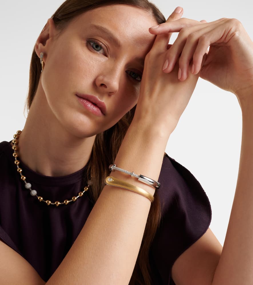 This Rainbow K Bracelet in 18kt Yellow Gold is a stunning display of radiant elegance and refined craftsmanship. Featuring a pear-shaped diamond (0.54ct) and pavé-set round diamonds (0.30ct), the design captures light beautifully across a polished gold band. Measuring 15.5cm in circumference with a 10mm max width, it symbolizes sophistication, glamour, and wearable artistry. Ideal for layering or solo wear, this bracelet reflects Rainbow K’s dedication to high-quality materials and contemporary luxury, offering a versatile, luminous accessory that enhances both casual and formal ensembles with sparkling brilliance and architectural design.