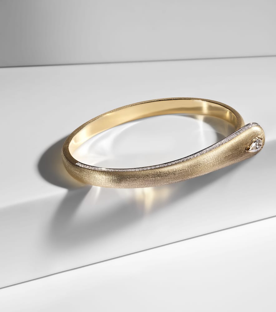 Handcrafted in 18kt yellow gold with 1 pear-shaped diamond 0.54ct and round-cut diamonds totaling 0.30ct. Max width 10 mm (0.4"); circumference 15.5 cm (6"). Made in France.