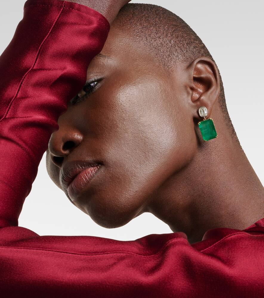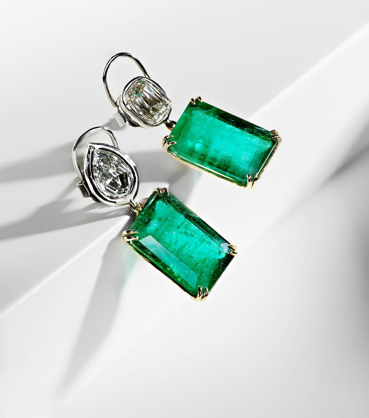 These Octavia Elizabeth Tribute Earrings in 18kt Yellow and White Gold exemplify extraordinary luxury and color artistry. Featuring 22.17ct emeralds, 1.51ct pear-shaped diamond (I color, IF clarity), and 2.01ct cushion-cut diamond (K color, VS1 clarity), the 35mm length and 12mm width create a striking, statement-making silhouette. Polished gold highlights each gemstone’s brilliance, reflecting Octavia Elizabeth’s dedication to meticulous craftsmanship and architectural design. Perfect for formal occasions, these earrings embody elegance, opulence, and wearable artistry, blending bold colored gemstones with precise diamond settings for a high-impact, luxurious jewelry experience.
