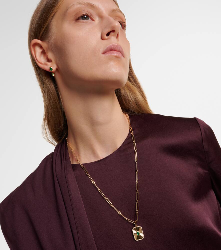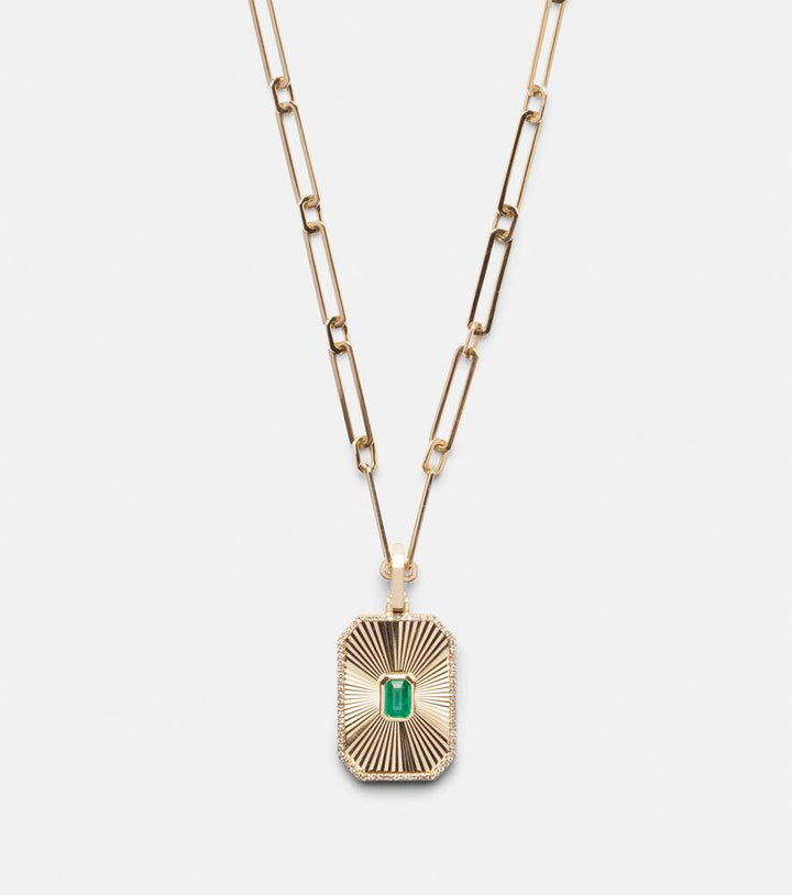 Handcrafted in 18kt yellow gold with baguette-cut emerald 0.77ct and round-cut pavé diamonds 0.68ct. Pendant length 36 mm (1.4"), width 17 mm (0.65"); chain width 4 mm (0.15"), adjustable up to 61 cm (24"). Lobster-clasp fastening. Made in the USA.