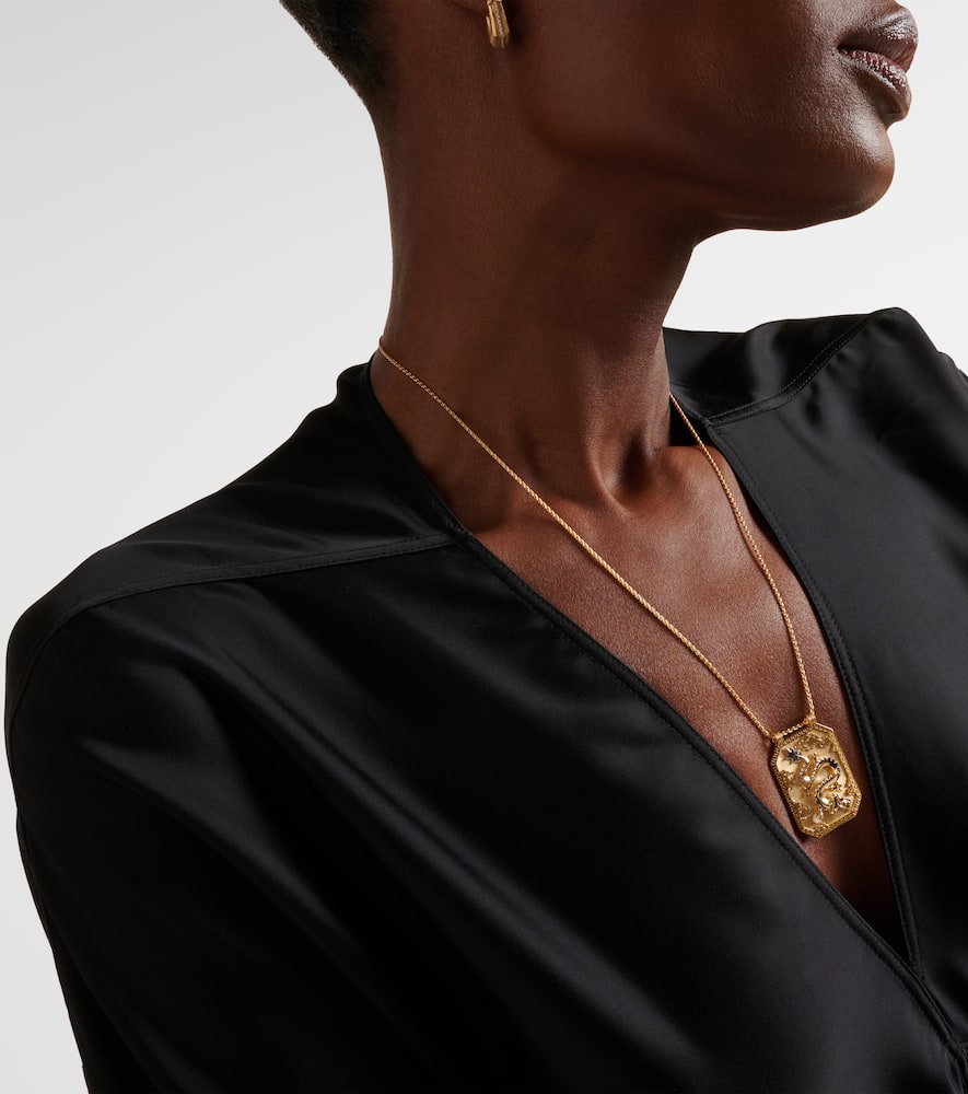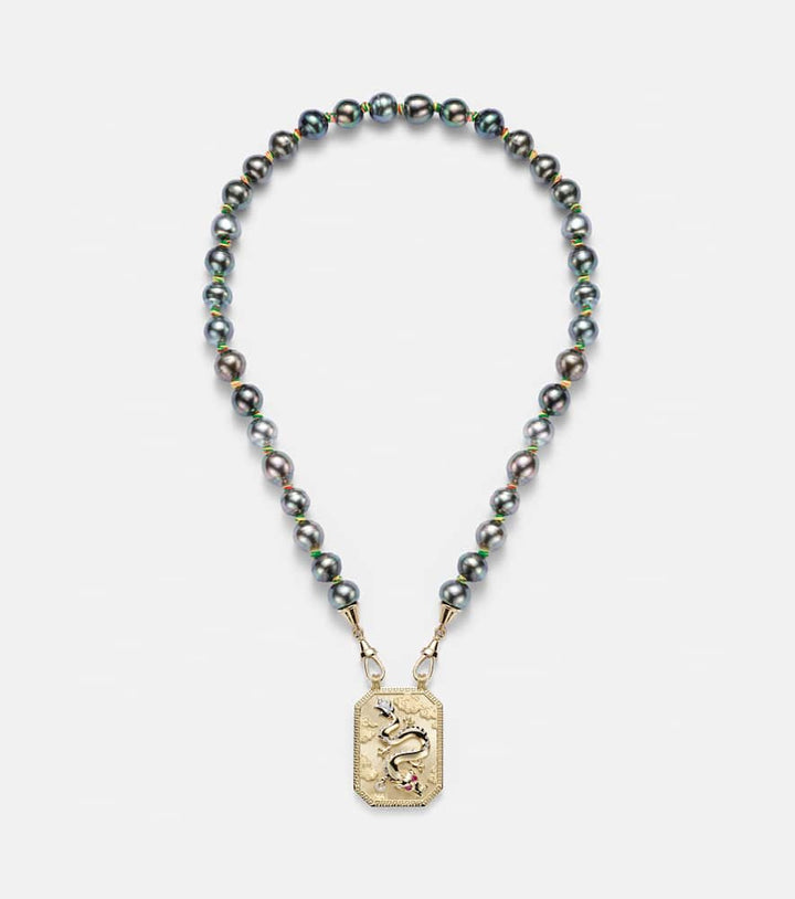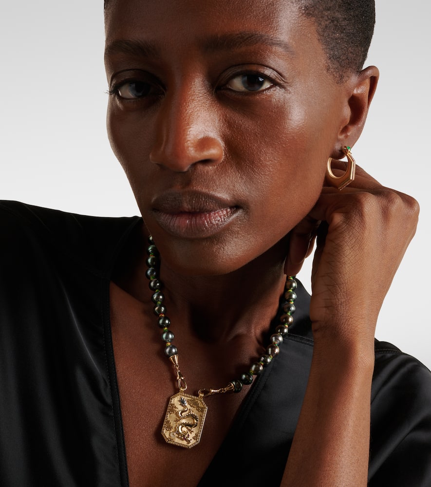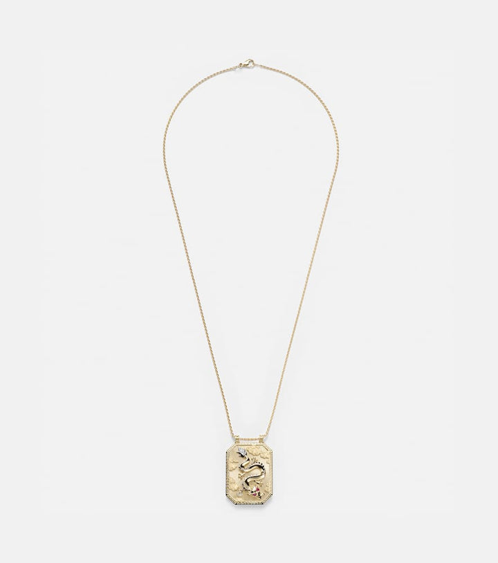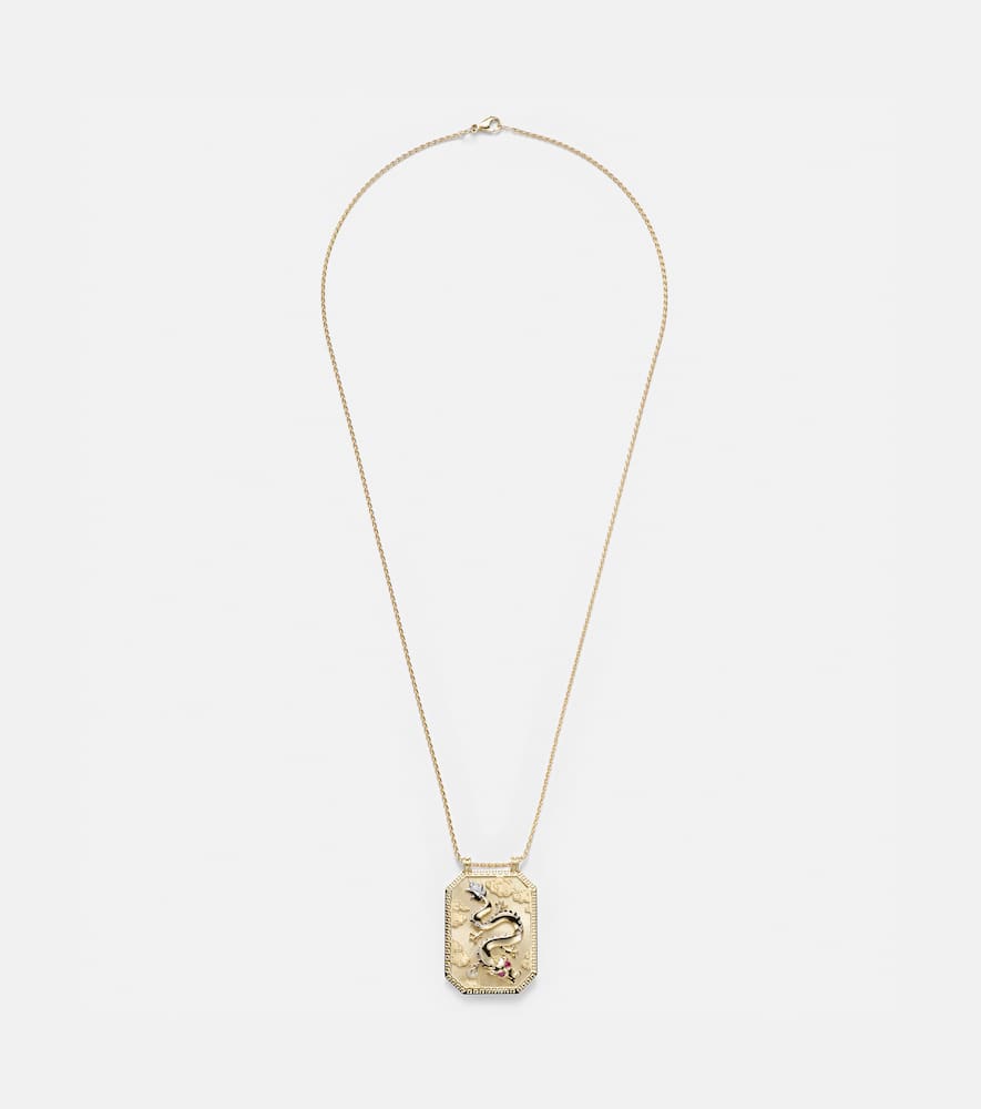 This Marie Lichtenberg Dragon Necklace in 18kt Yellow Gold showcases 3 pear-shaped rubies (0.16ct) and a round pearl, suspended on an adjustable chain with 38x25mm pendant. The polished gold enhances gemstone radiance, combining mythical inspiration with wearable luxury. Reflecting Marie Lichtenberg’s contemporary craftsmanship and refined design, this necklace embodies elegance, bold storytelling, and high jewelry artistry, offering a versatile statement piece that elevates any ensemble with luminous color, sculptural design, and modern sophistication.